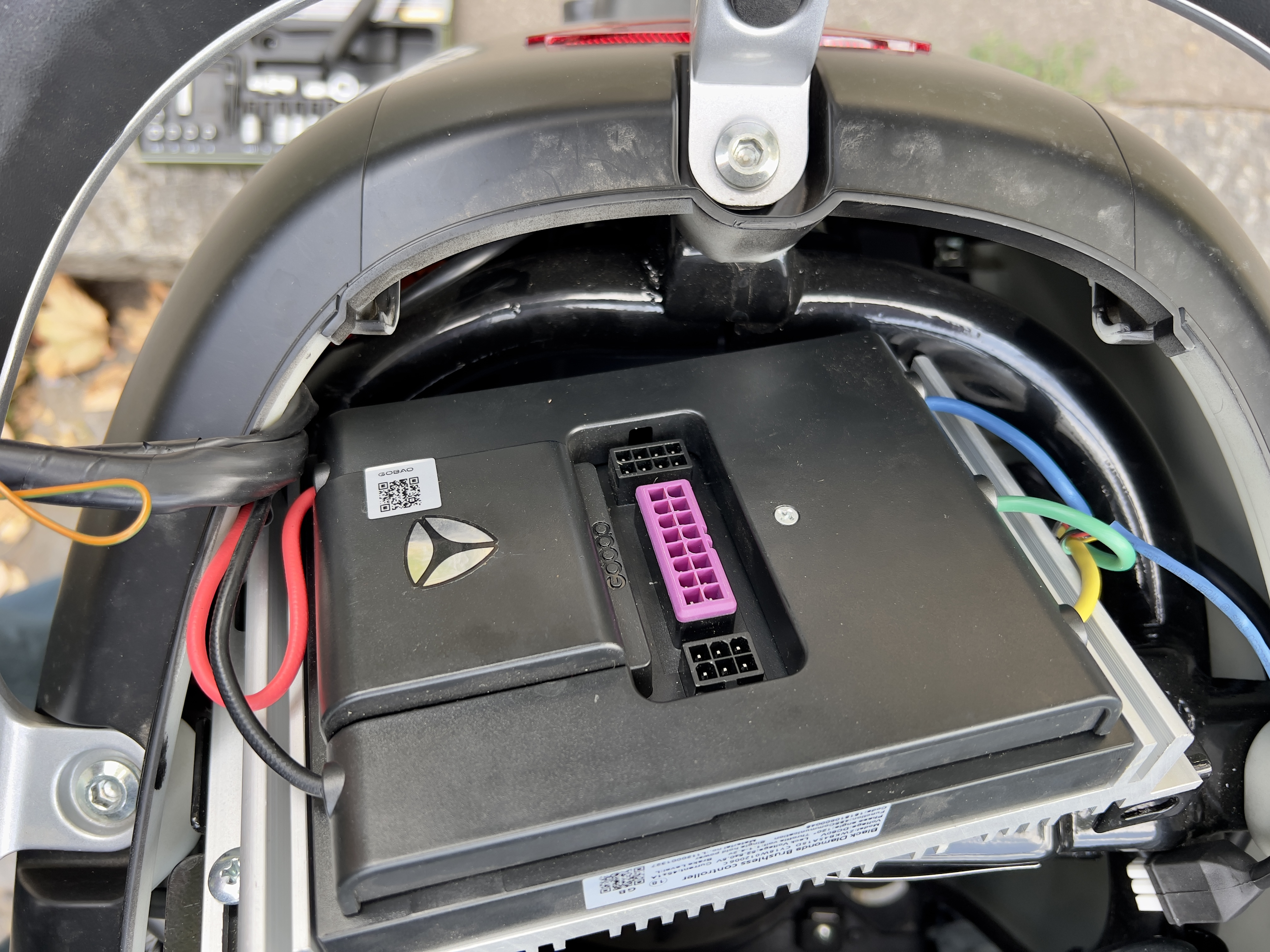 Ich habe den Akku abgesteckt, das Helmfach herausgenommen (ist mit 4 Schrauben befestigt), dann das Motor-Steuergerät herausgenommen (2 Schrauben, es ist senkrecht eingebaut ganz am Heck wo der Sozius sitzt - ein Kasten mit Aluminium-Kühlrippen). Vorsicht dabei mit den Kabeln, dass nichts abreisst, sie sind teilweise recht kurz).