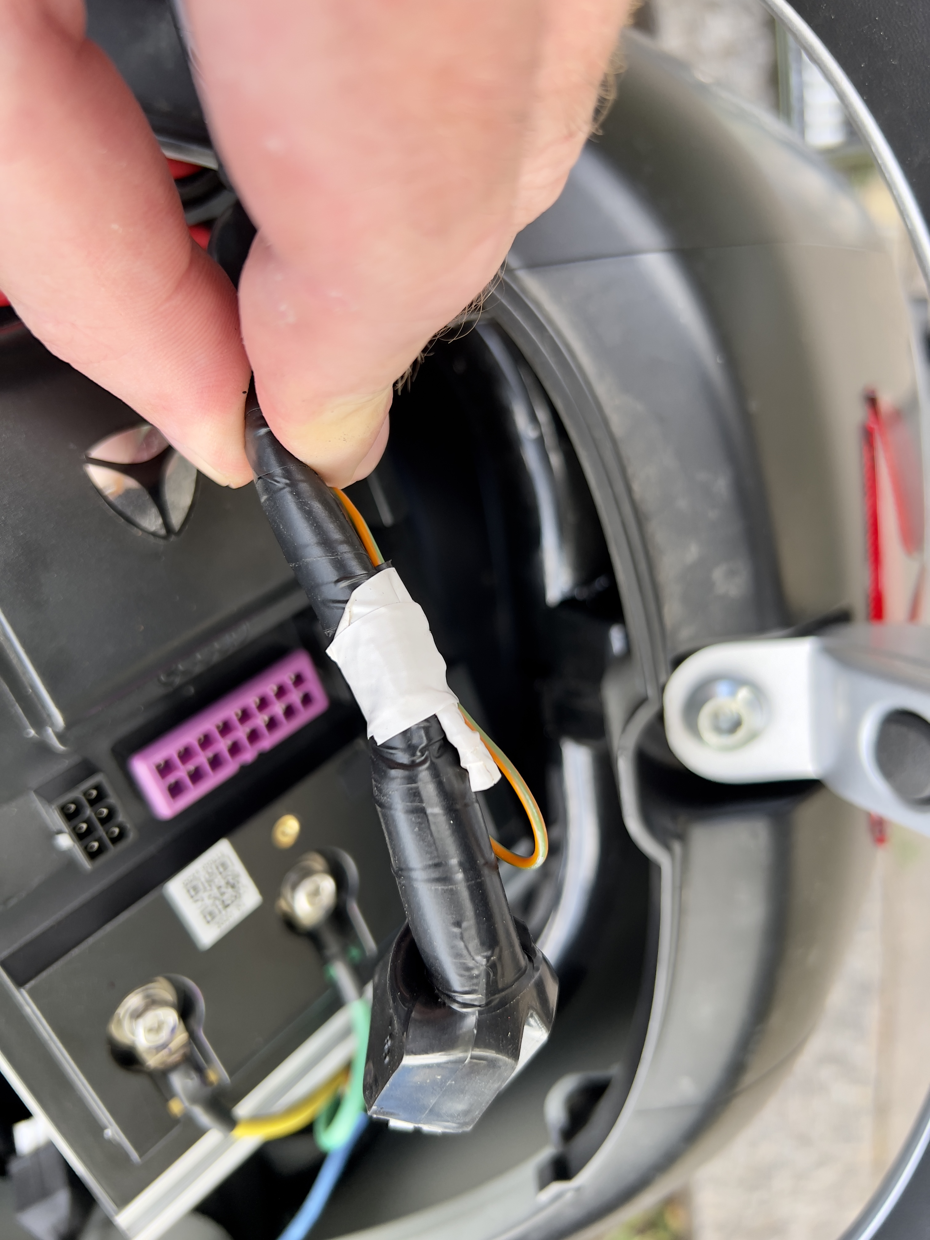 Anschließend die Stecker auf der Oberseite abstecken: Die kleine Kreuzschraube vom Deckel lösen, dann hat man Zugang zu den anderen Kabeln. Beim blauen Draht ist zusätzlich ein dünner braun/grüner Draht befestigt - das ist der Übeltäter, diesen habe ich entfernt - Schraube raus und nur mehr den Blauen angeschraubt: Den Braun/Grünen habe ich isoliert und am Kabelbaum befestigt damit er nicht lose herumhängt: Deckel wieder drauf, Steuergerät einfädeln und festschrauben. Beim Einfädeln des Helmfachs ist bei mir der Seilzug des Akkufachs herausgerutscht: Diesen wieder einhängen: Beim Einbauen darauf achten, dass der Seilzug nicht eingeklemmt wird, Helmfach festschrauben - fertig.