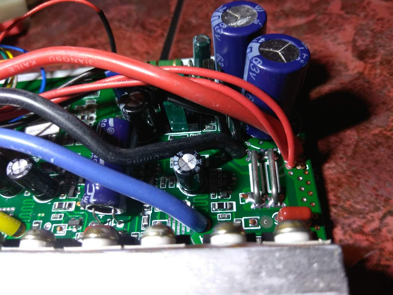 die chinamännchen haben auf einen der drahtwiderstände von hause aus schon einen lötzinnklecks aufgetragen. ich hab das gleich mal noch erweitert und beim zweiten gleiches getan. also jetzt ca. 1800-2000 watt möglich. eines hab ich auch gleich kontrolliert, der controller kann in dem jetzigen zustand keinen 60 volt akku. die kondensatoren müssen aufgerüstet werden. sie gehen nur bis 63 volt. also nur ein 52 volt akku möglich.