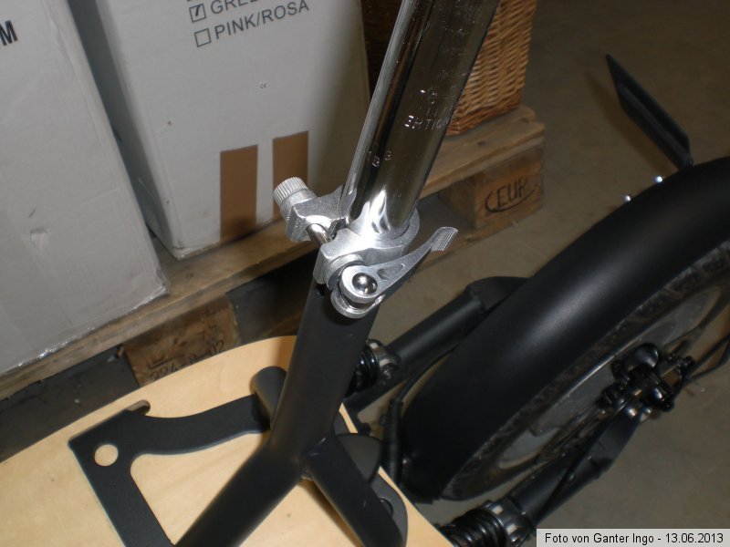 Leider habe ich vergessen zu fragen, ob es das neue Sattelrohr später dann auch als Ersatz- /Zubehörteil geben wird. Das wäre sicherlich auch noch bezahlbar. Aber der schwarze Dreibeinständer, der auch erneuert werden müsste, dürfte doch so einiges kosten. Ob sich das dann lohnt? Ich werde mal bei einem der nächsten Telefonaten mit der Fa. Eneway klären, ob es diese Neuerung auch als Zubehör bzw. Ersatzteil zu kaufen geben wird.