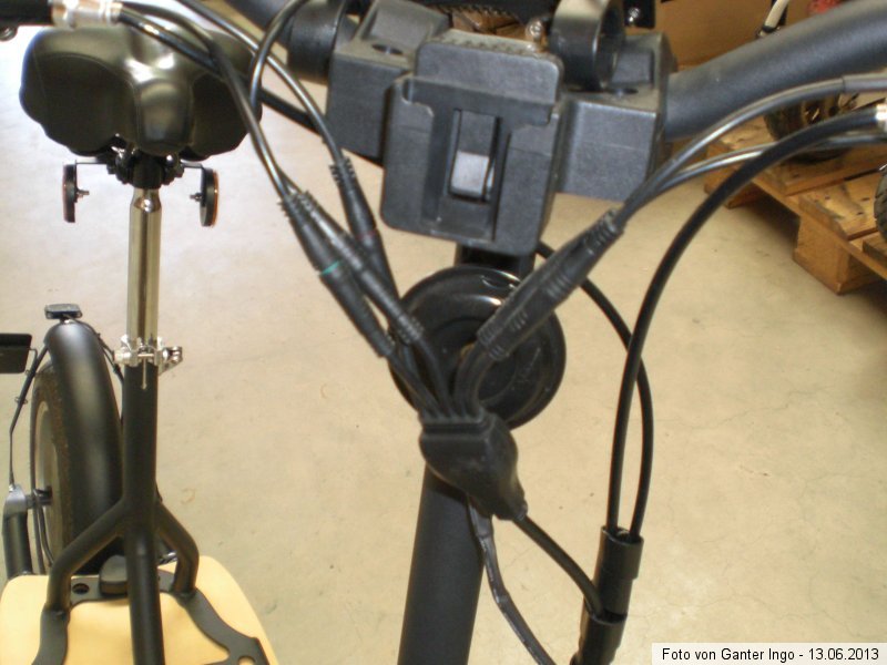 Oben am Lenker gibt es die Bauteile Schalter für Licht und Hupe, die Hupe, Bremsgriff links, Bremsgriff rechts, Stromgriff mit den drei LED für die Ladestandsanzeige. Deren Kabel werden alle zusammengeführt und mittels eines Kabelschlauches nach unten zum Akkukasten, in dem sich auch der Controller mit seinen ganzen Anschlüssen befindet, herunter geführt und dort an das jeweils passende Steckergegenstück angeschlossen.