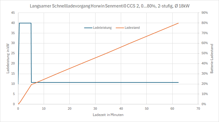Die ersten 5 Minuten wird voll geballert mit 40kW, was die Batterie schnell aufheizt, weit jenseits der möglichen Kühlleistung im Senmenti 0. Danach fällt die Ladeleistung steil ab, mit ab den ersten 5 Minuten durchschnittlichen 18kW bis 80% Ladestand. Ob kontinuierlich fallend wie hier, oder in Stufen fallend wie bei Mosts Skizze (und leider bei den Chinesen beliebt :( ), ist natürlich offen. Der einzige Fakt, der sich aus dieser Betrachtung ableiten lässt, ist, dass ein solcher Schnellladevorgang gut und gerne über 40 Minuten dauert, was wohl durchaus mit den Energicas zu vergleichen ist, dort nur beim ersten Ladevorgang, beim Senmenti 0 womöglich auch bei den folgenden Ladevorgängen.