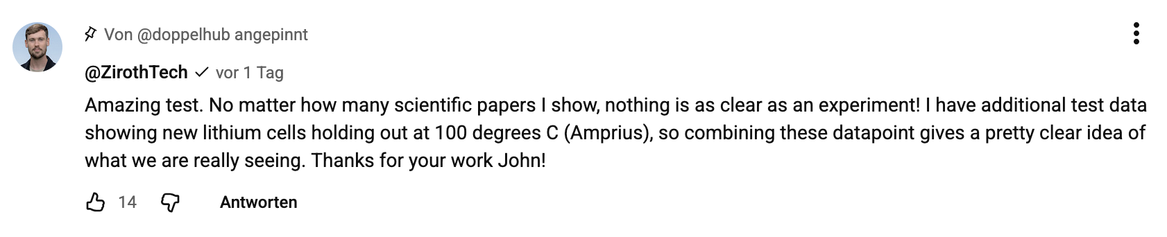 Ist das erst gemeint? Er hat eine x-beliebige 5 Jahre alte tote Zelle aus seinem Bestand gewählt um das Thema Pouchhülle und Verklebung (die Grundlage des letzen Donutests und die Begründung von Marko warum die Zelle aus dem Test vorher einen "Fail" geliefert hat") zu widerlegen. Mehr nicht.STF2023 hat geschrieben: Fr 27. Mär 2026, 07:53 Schade, dass er sie danach nicht noch ein paarmal geladen und entladen hat um zu zeigen, dass das auch aktuelle Lithium Zellen können.