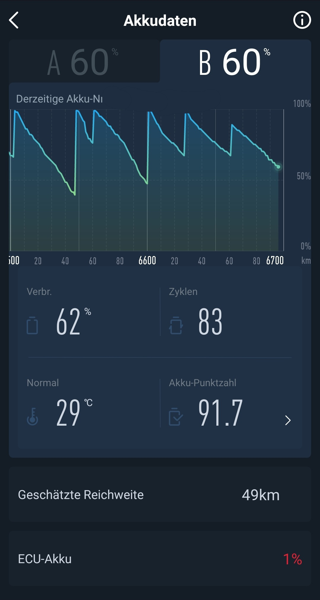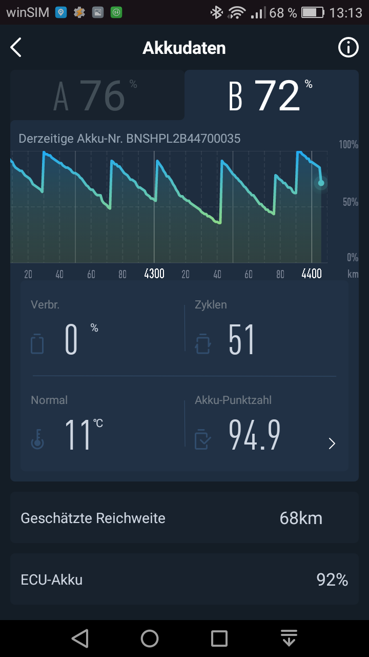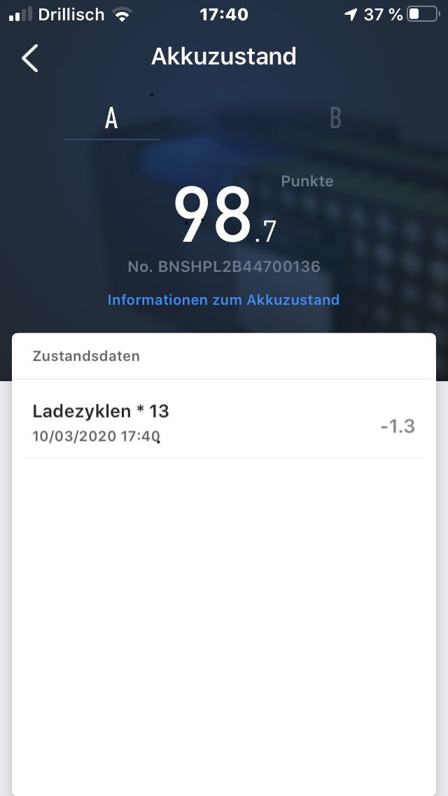 Ich würde sagen, dass mit nur noch 59 Niu-Punkten (das hat bei 100 angefangen...) nach 410 Gesamtladezyklen durchaus dem Akku etwas anzumerken dürfte. Bin gespannt auf die Antwort von @HALODRI.