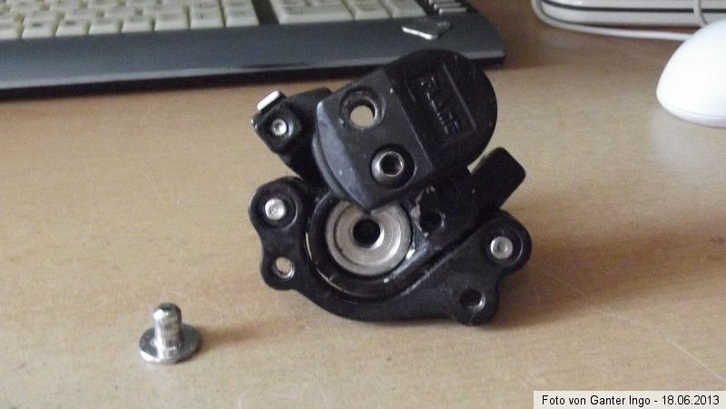 Das ist mein vorderer Bremssattel auf dem Schreibtisch. Ich musste ihn komplett demontieren, da sonst eine Fahrt bzw. ein Schieben nicht mehr möglich war.