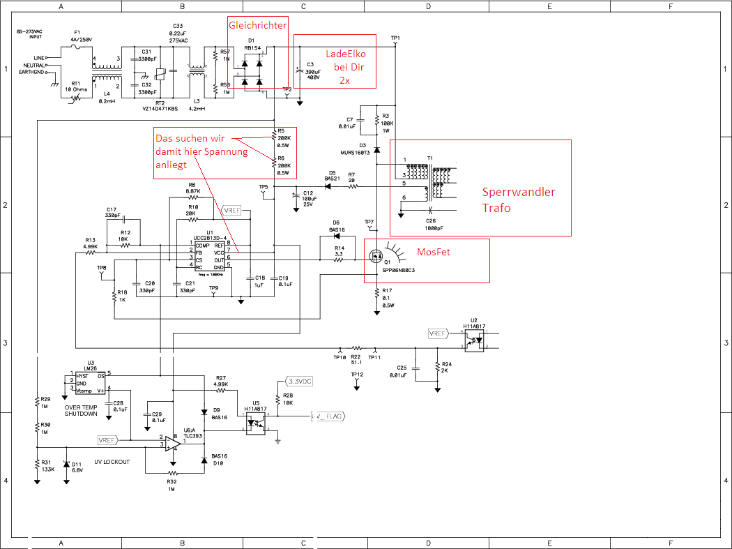 Da die zwei dicken fetten 100kOhm Widerstände nur schwerlich kauptugehen können nahm ich mir als erstes die im Zielgebiet angesiedelte Diode vor. Im eingebauten Zustand gaukelte sie mir, wie andernorts z.T. auch schon, einen fast perfekten Kurzschluss in beiden Richtungen vor, also habe ich das eine Ende ausgelötet, und siehe da: ENDLICH das erste DEFEKTE Teil gefunden!!! Tatsächlich Kurzschluss in beiden Richtugnen mit gerade noch um je 2,4mV Spannungsabfall. Im Ausschnitt unten ist es die schwarz hinterlegte, die den nachgeschalteten Elko (die Kapa kann ich nicht erkennen, da genau dort gekennzeichnet, wo die benachbarten 100KOhm Widerstände keine Sicht drauf lassen...) mit Strom versorgen sollte. Der Elko ist aber für Betrieb bis 400V und 105°C gekennzeichnet. Was halten wir jetzt von dieser Erkenntnis? Könnte es auch den Elko zerschossen haben? Ich denke eher nicht, weil ja schon alles schön gleichgerichtet ist an dieser Stelle und es dem Elko völlig egal ist, ob er jetzt 326 oder 325,6V kriegt? Daher stellt sich die Frage, wozu an dieser Stelle überhaupt eine Diode eingebaut sein könnte?
