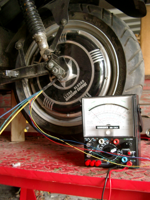 - Messgerät an die Motorkabel in jeder Kombination und Hinterrad gedreht mit folgendem Ergebnis: