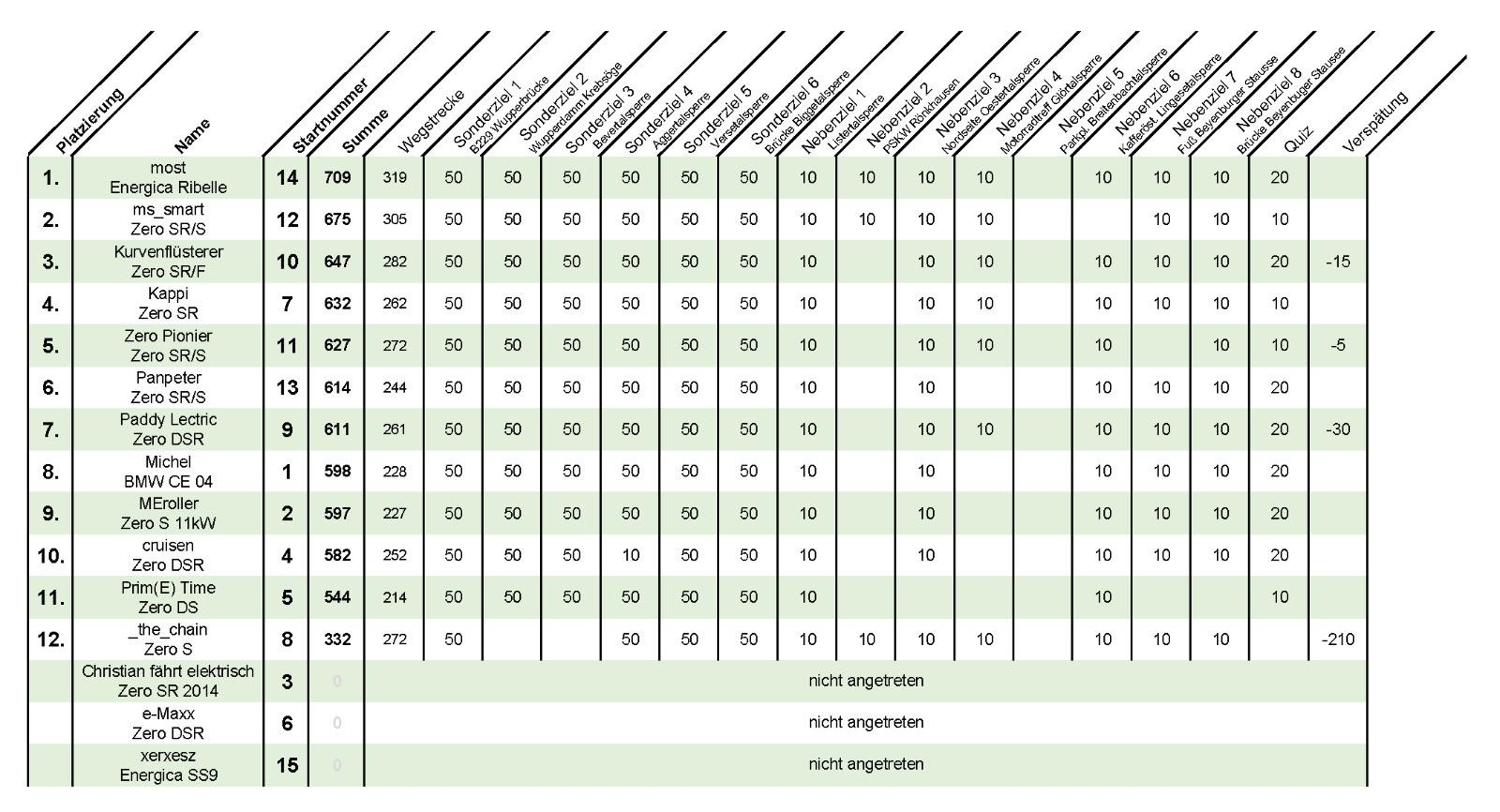 Hier mal die Ergebnistafel. Michel mit dem CE 04 ist mit genau einem km mehr als ich angekommen, so dass er einen Punkt vor mir lag :lol: