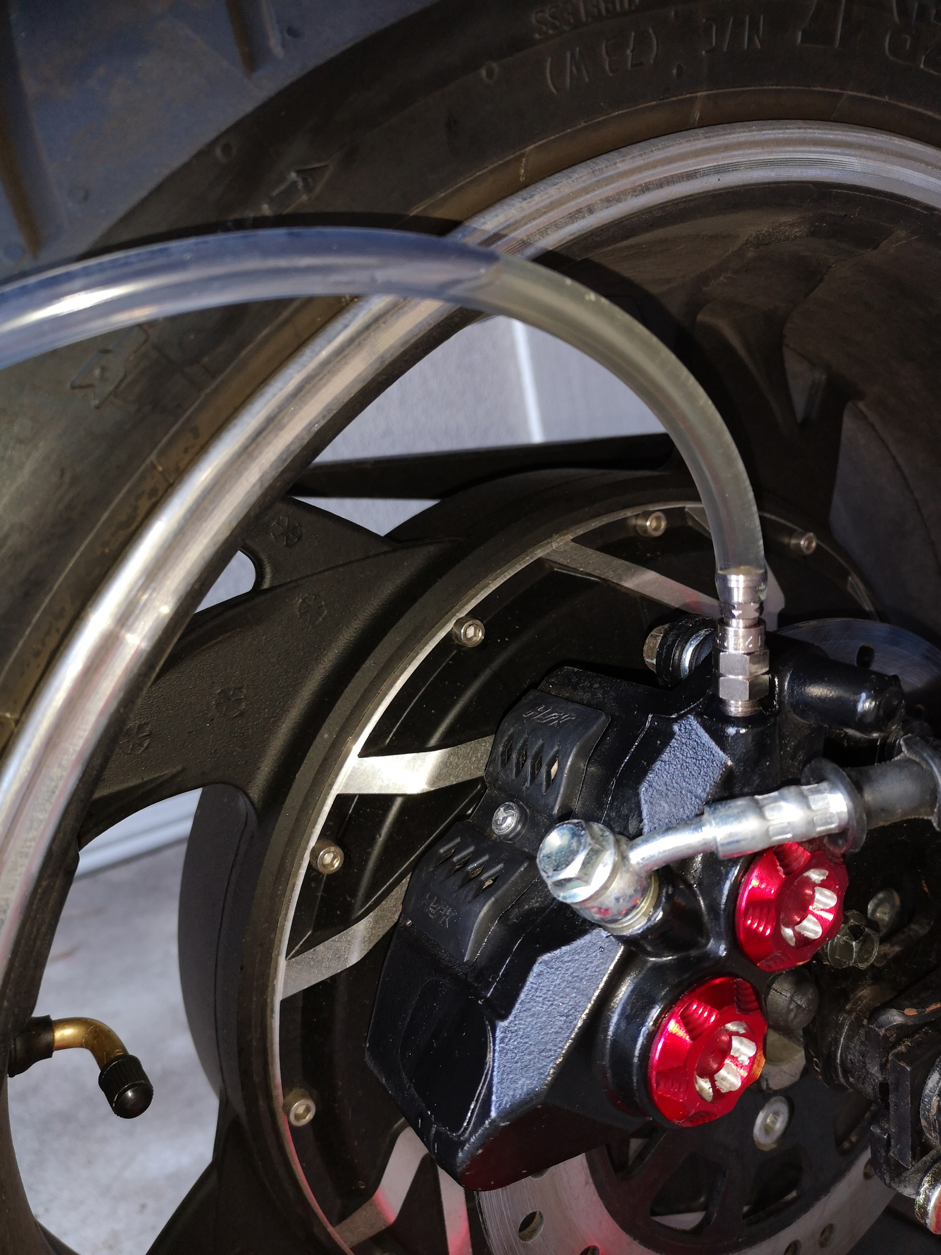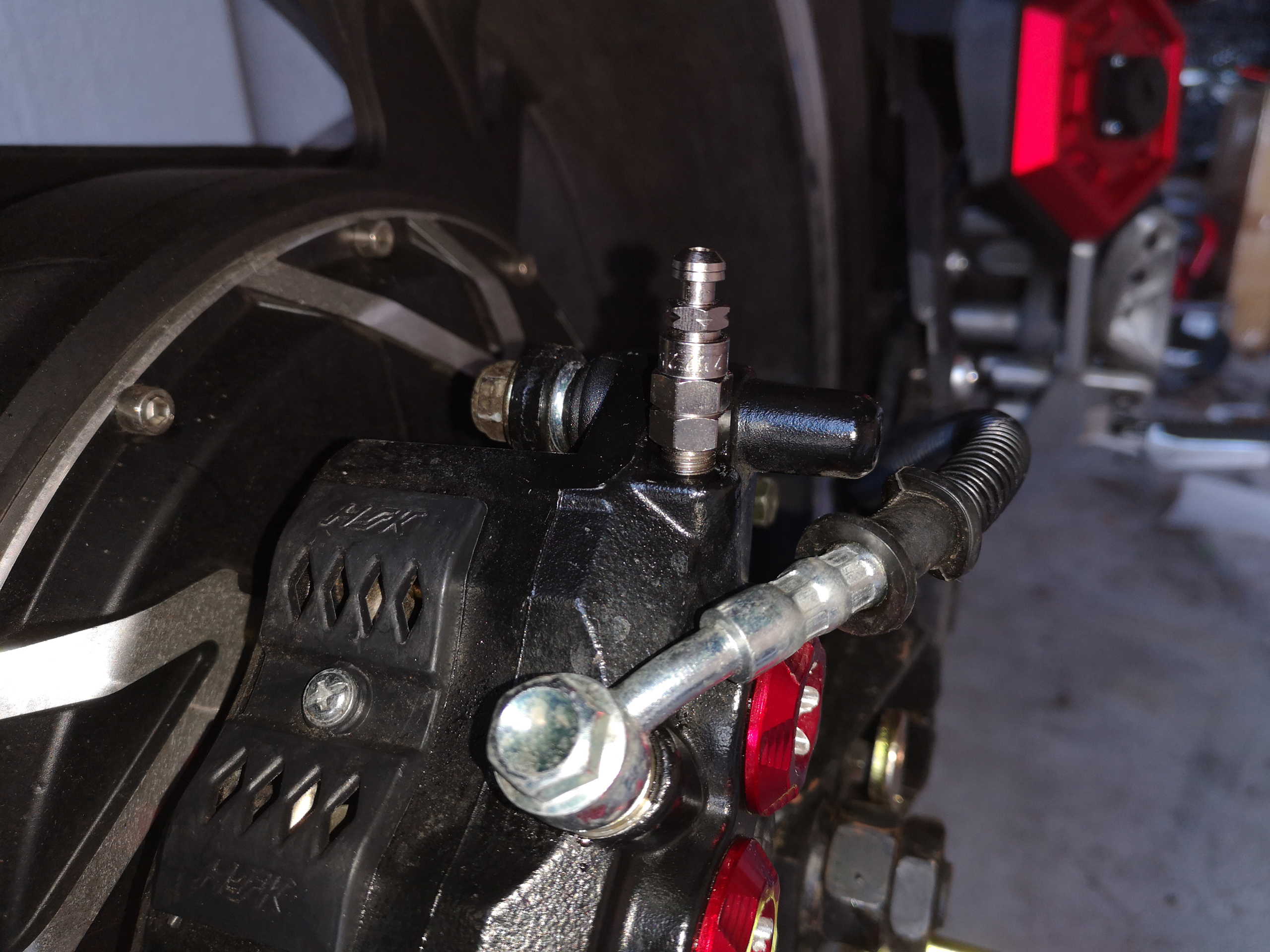Dann die E-Odin hinten aufgebockt und mit einem M8er Schlüssel die Entlüftungsschraube um 1/4 Umdrehung geöffnet.