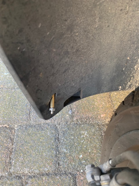 - Die unteren Schrauben im Radkasten habe ich nur mit Verlängerungsstücken versehen, ohne den Winkel... Das steht dann etwas raus, hält aber gut und ist auch dem Reifen nicht im Weg. Die Winkelkonstruktion war mit zu kompliziert, habe nicht das nötige Werkzeug im Haus.