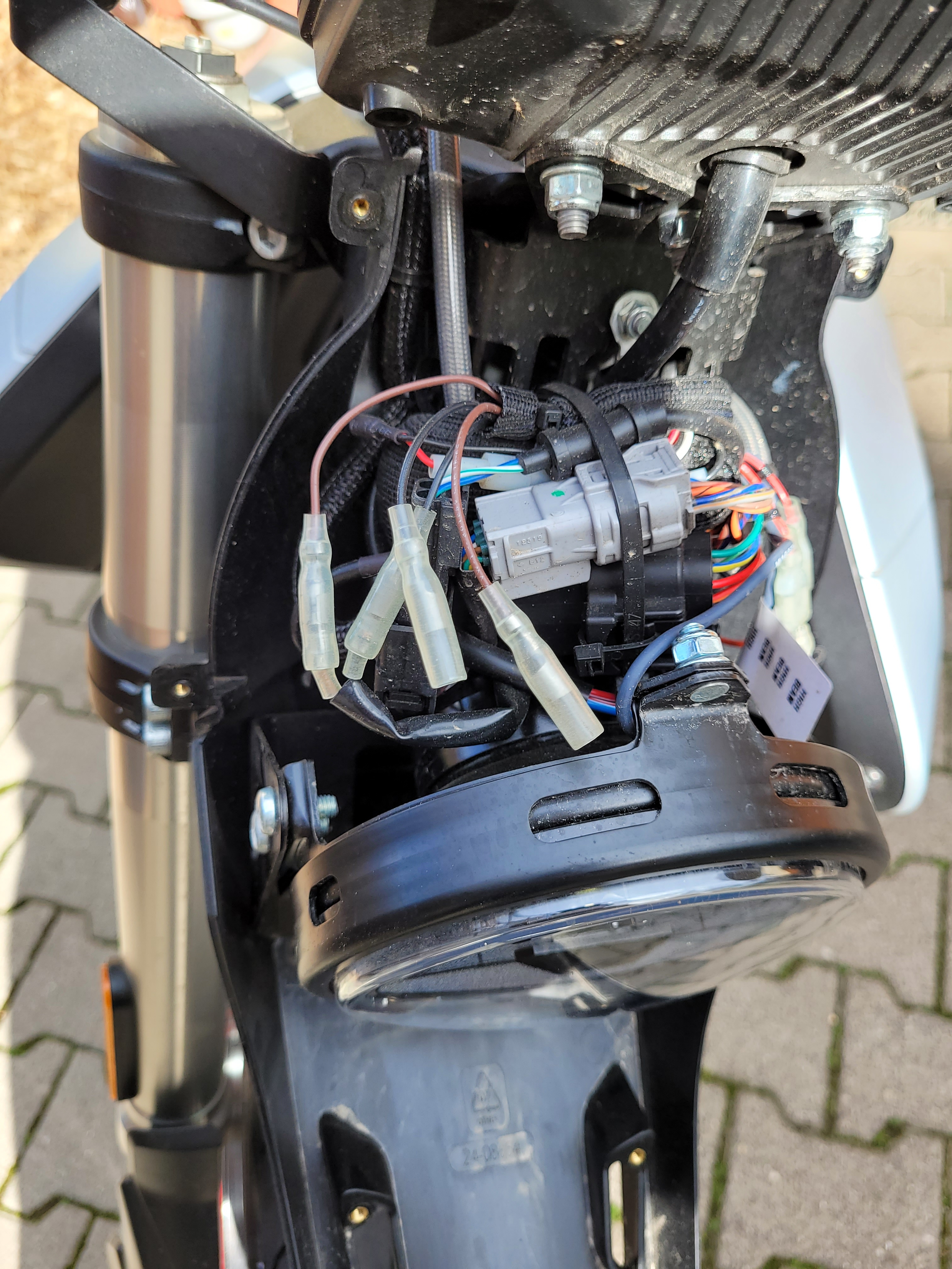 Hinter der Lichtmaske der FXE sind 2 freie Kabel. Das Braune ist Klemme 15, also geschaltetes Zündungsplus.