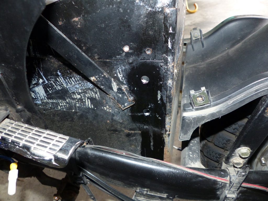 Am geplanten Einbauort des Motorklemmbretts, seitlich hinten an der Seitenwand vom Batteriefach, ist ein Haltebügel für das Batteriefach festgeschweißt. In diesem Bild sind schon die zwei Ø8,5 Löcher gebohrt und mit drei Schichten Brunox bedacht: