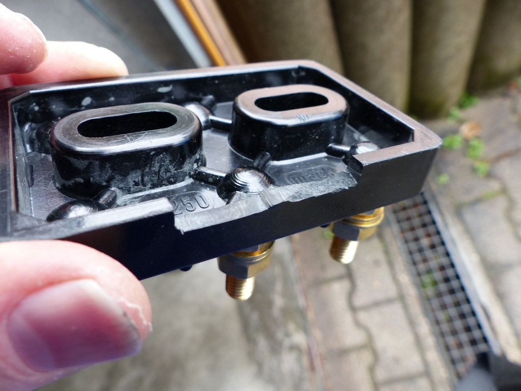 Jetzt kommt einer der anstrengendsten Aktionen des Umbaus: den entsprechenden Aus"schnitt" an der duroplastischen Basisplatte des Motorklemmbretts machen! Zuerst ging es mittels dreier Mini-Stichsägenblätter etwa die Hälfte des Weges, schlussendlich mit Wasserkühlung, aber ab da ging es auch über eine Stunde hinweg einfach nicht mehr vorwärts. Das Zeug ist quasi glashart. Also habe ich die zweite verbliebende Hälfte des Ausschnitts mit der Rohrzange gepackt und herausgebrochen. Das Endergebnis:
