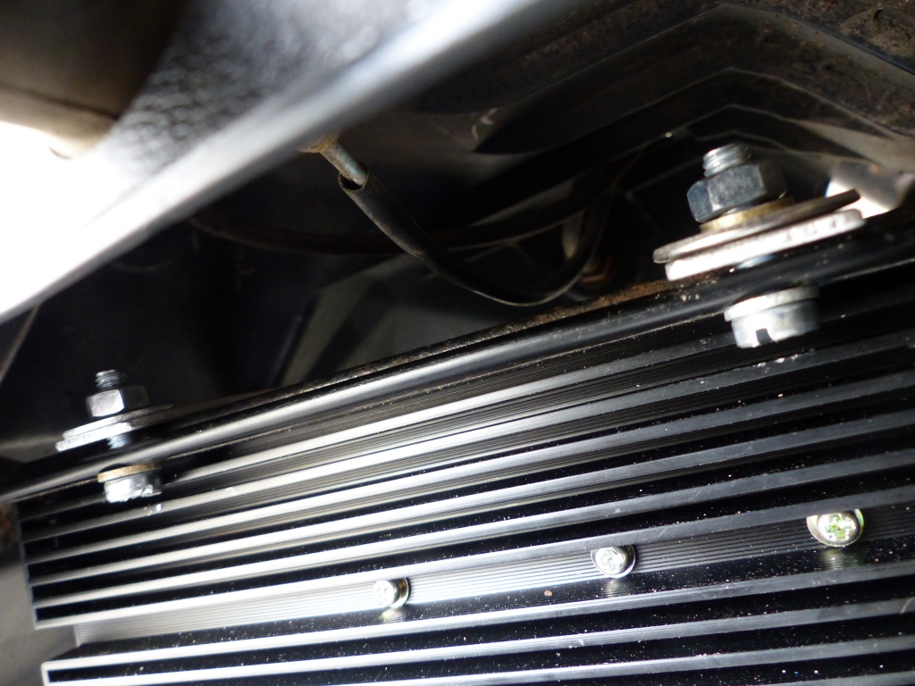 Der letzte Schritt war der Antrieb der Batterieheizung und die Verschaltung derselben. Zuerst mal galt es, einen geeigneten Anbauort für den bislang im Helmfach liegenden Kelly DC-DC-Wandler zu finden. Der ist ja intern voll vergossen und daher auch durchaus für externe Anbringung geeignet. Und es fand sich ein perfekt passender Ort: unten an den zwei Verstärkungsstreben des Kennzeichenhalters. Ich weiß, Alf hatte da mal seinen Eigenbau-Gepäckträger hinten drauf abgestützt, woraufhin die Strebenschweißung brach an seinem GK183. Aber der DC-DC-Wandler-Backstein sollte etwas leichter sein, und ist auch nicht ganz hinten dran. Beim Thunder-Fury scheinen die Schweißungen auch sehr solide zu sein. Die Befestigungsbohrungen des Wandlers waren gerade so weit auseinander, dass die zugehörigen M6 Schrauben gerade so die zwei Streben außen umfassten. Oben drüber habe ich den Rest meiner Alu-Ladeleiste als "Querbalken" drauf, und so sind die Streben schön eingeklemmt zwischen Wandler und Alu-Leisten:
