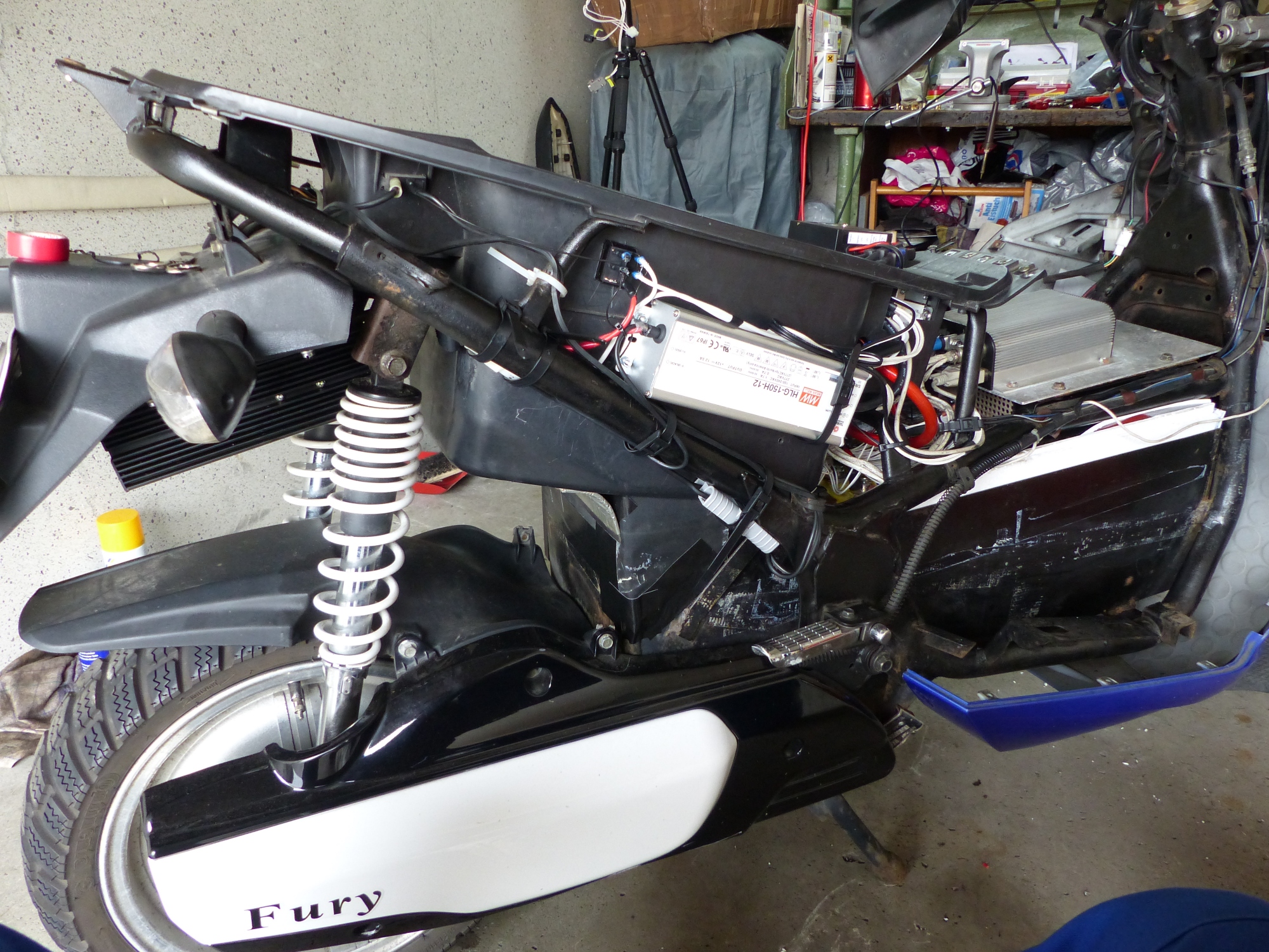 Hier ist die Gesamtansicht von der Seite: ganz links unter der Kennzeichenhalterung ist besagter DC-DC-Wandler zu erkennen, seitlich am Helmfach das MeanWell (Halogenleuchten-) Schaltnetzteil HLG150-H-12 für den Netzbetrieb, und am oberen hinteren Eck des Schaltnetzteils der 2-polige 3-stufen Kippschalter, über den oben das "Zündschloss-Signal" und die 13,5V DC-Plusleitung des DC-DC-Wandlers geschaltet werden, und unten die Plusleitung des Schaltnetzteils. Kurz bevor die Kabel ins ehemalige Batteriefach im Helmfach einbiegen ist eine 15A Flachsicherung in der Plusleitung vom Thermostaten drin als Absicherung auf der Heizseite. Der Thermostat sitzt oben auf dem Batteriefachdeckel. Über den Kippschalter links oben am Helmfach kommt die Batteriespannung für den DC-DC-Wandler, die unverändert an den Controller-Anschlüssen von der Batterie abgenommen wird und in Bildmitte über die grauen Anderson SB-50 Stecker dem DC-DC-Wandler zugeführt wird.