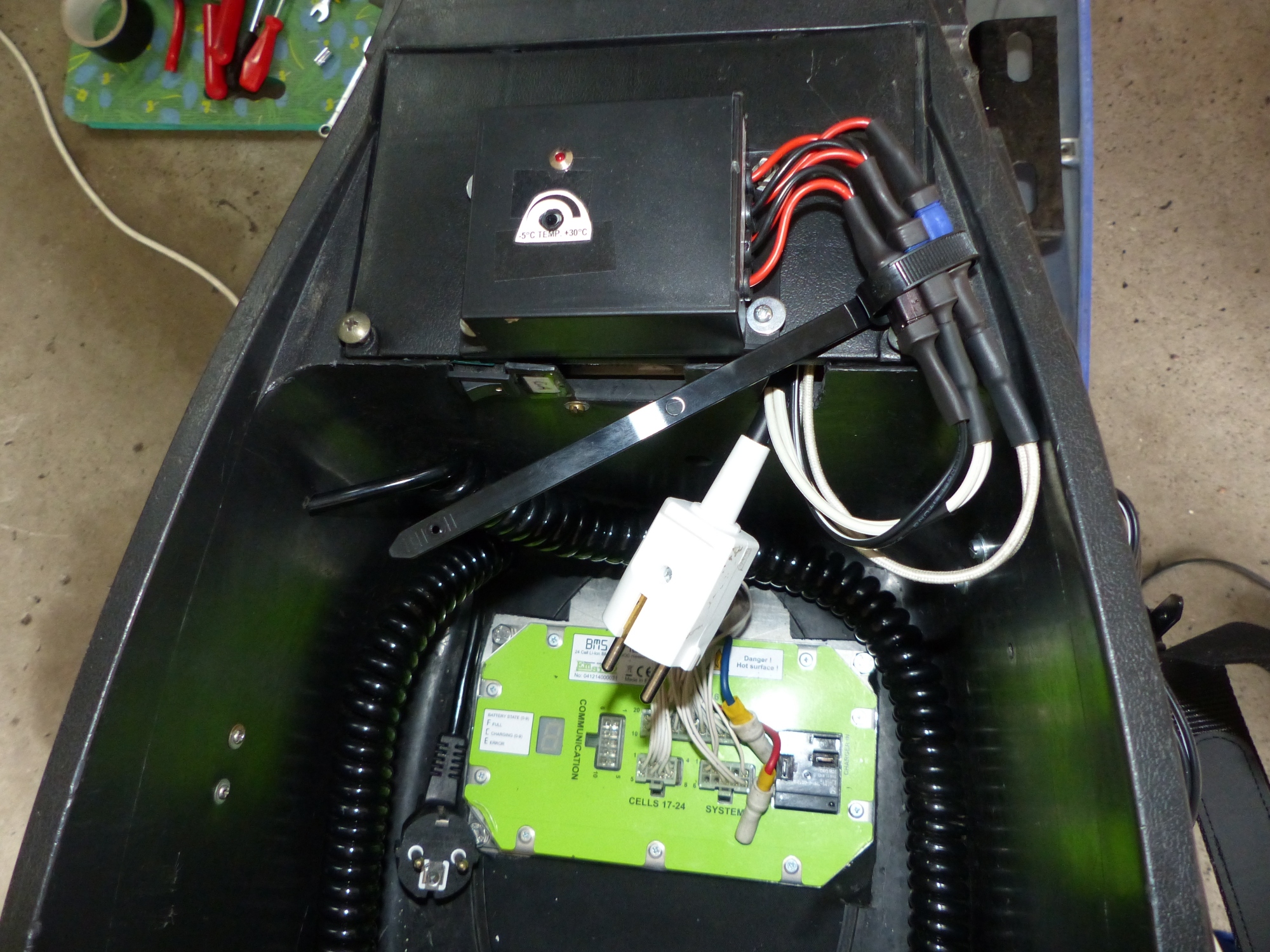 Hier ist der vordere Teil des Helmfachs von oben, mit dem Thermostaten auf dem "Batteriefach"deckel und seinen Zuleitungen, für die ich mir noch eine gescheite Befestigung ausdenken muss. Ich hätte wohl die Kabel aus dem Thermostaten heraus etwas länger machen müssen... Das BMS unten im Helmfach ist noch nicht ganz angeschlossen und auch noch nicht abgedeckt. Ebenfalls zu sehen ist das zu kurze Netzkabel vom Schaltnetzteil mit dem weißen Schuko-Stecker dran.