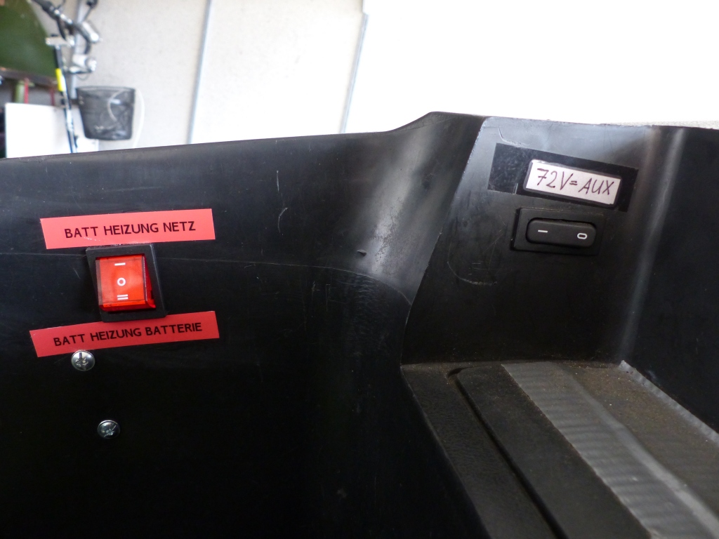 Hier noch die Helmfachansicht innen von links. Rechts in der hinteren Nische für das Rahmennummer-Guckloch (unter der Klappe) ist der Kippschalter für die Batteriespannung zum DC-DC-Wandler, die ich bei nicht-Gebrauch der Batterieheizung ganz abschalten kann. Links der 3-Stufenschalter mit Beschriftung. In Mittelposition "0" ist die Batterieheizung aus.