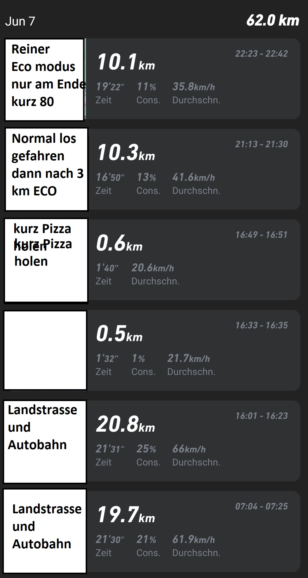 Also ich bin neulich 64 km gefahren bei am Ende 27 % SoC.