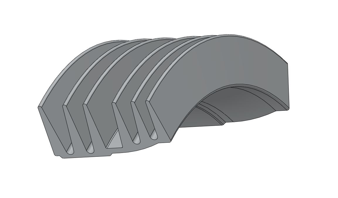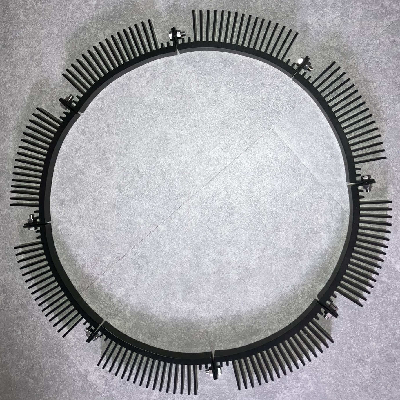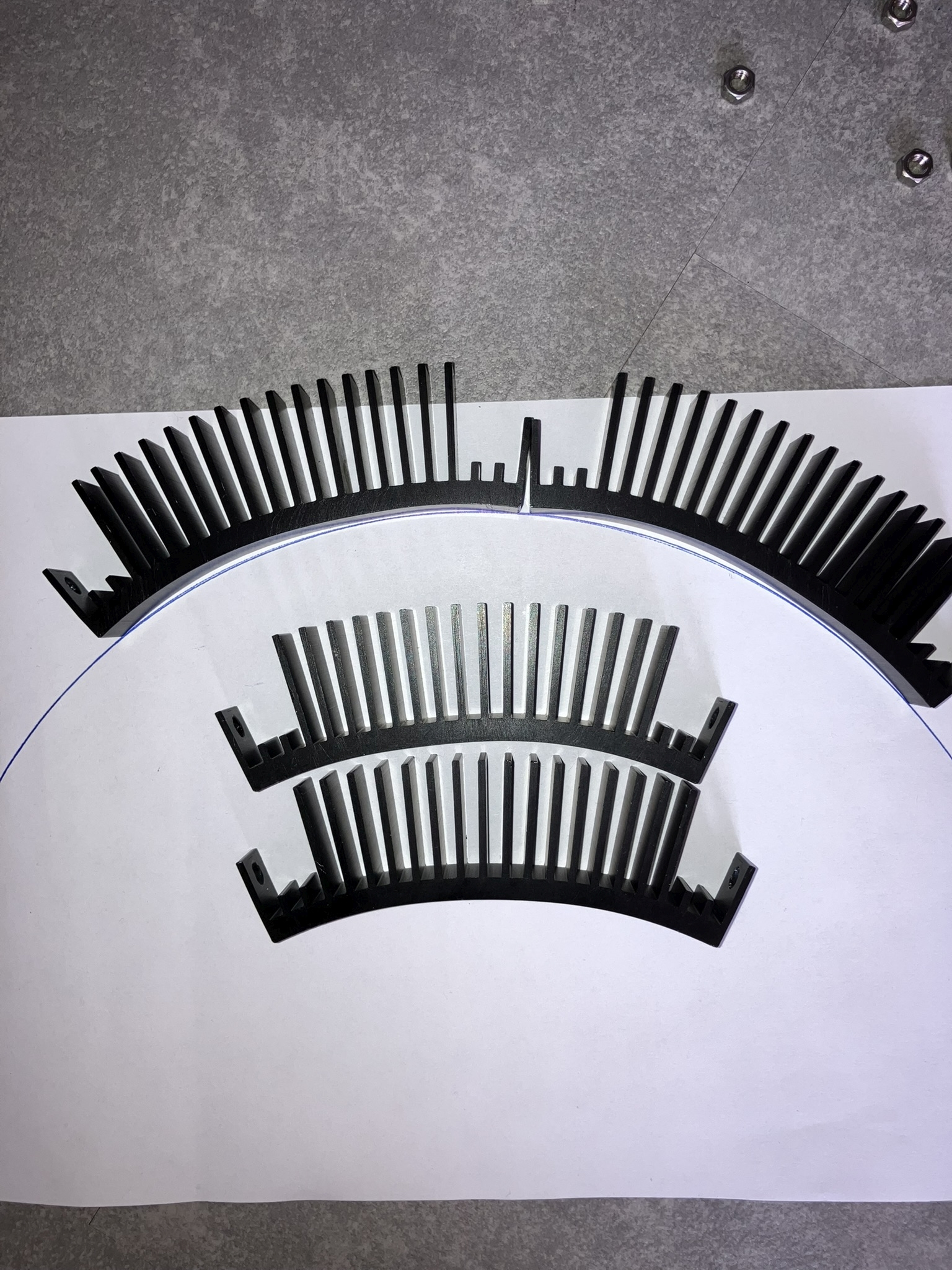 Die Segmente habe keine gleichmäßige Krümmung, sieht aus wie übers Knie gebogen, dadurch ist kein gleichmäßiges Anliegen am Motor gewährleistet. Will man die Kühlrippen montieren, muss eine Speiche entfernt werden, sonst ist das Einfädeln nicht möglich.