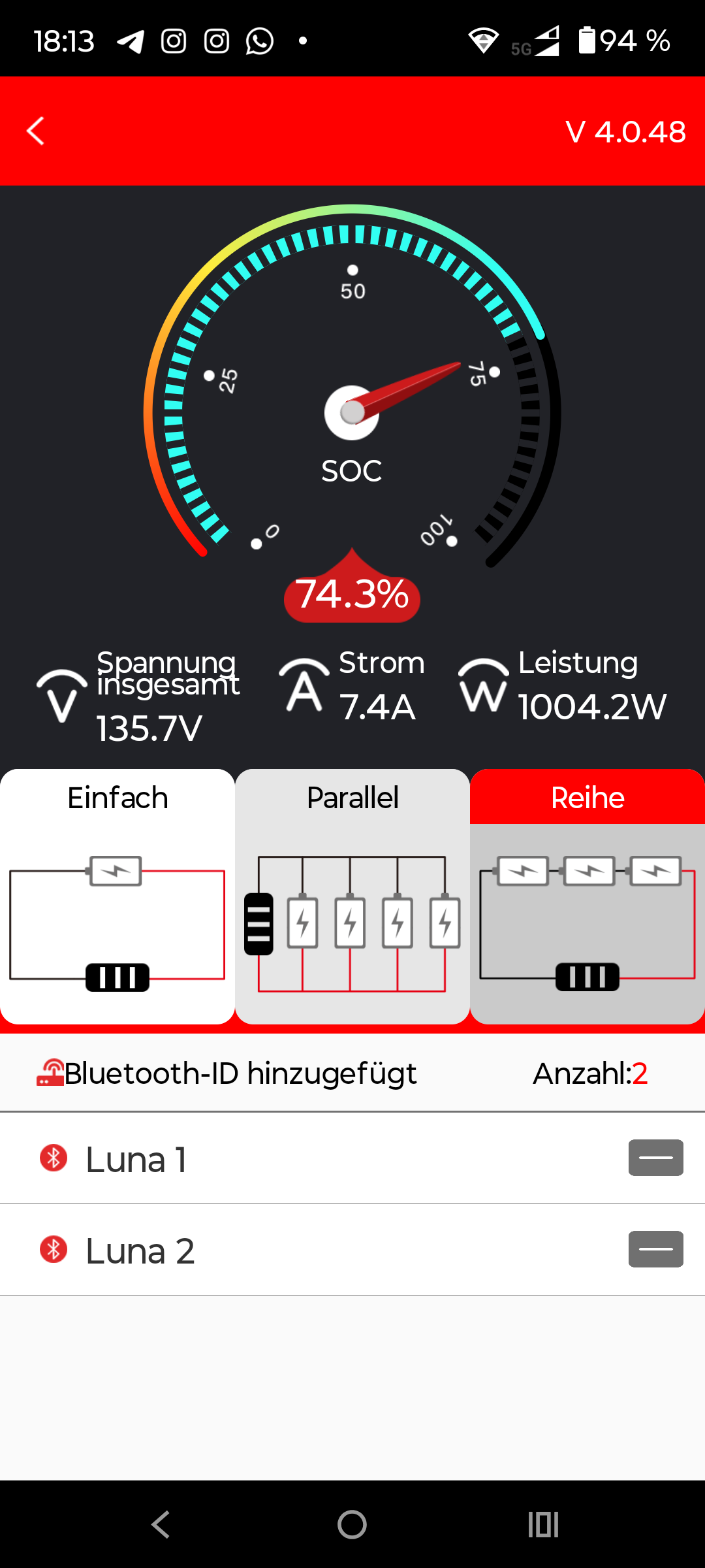 Ich hoffe ich habe dem Moderator nicht zu viel kostbare Zeit vom Sonntag gestohlen, aber wir haben uns ein paar schöne Stunden gemacht. Jetzt ist noch Kommunikation mit dem Controller in Arbeit und etwas Routine mit dem neuen BMS zu erlangen . Beste Option wäre beides Akkus parallel zu sehen oder einfach umzuschalten, mit 2 Handys ist etwas übertrieben