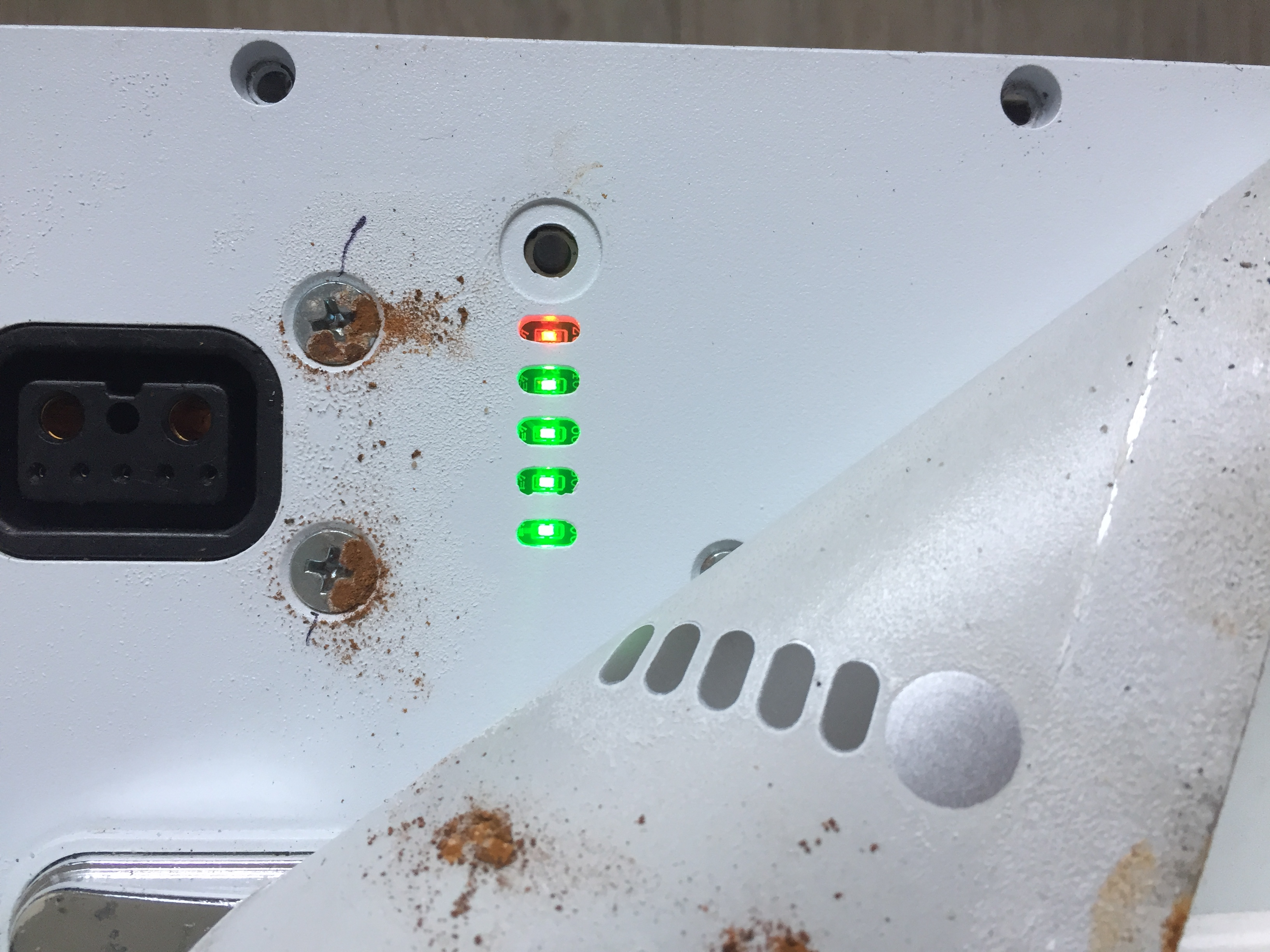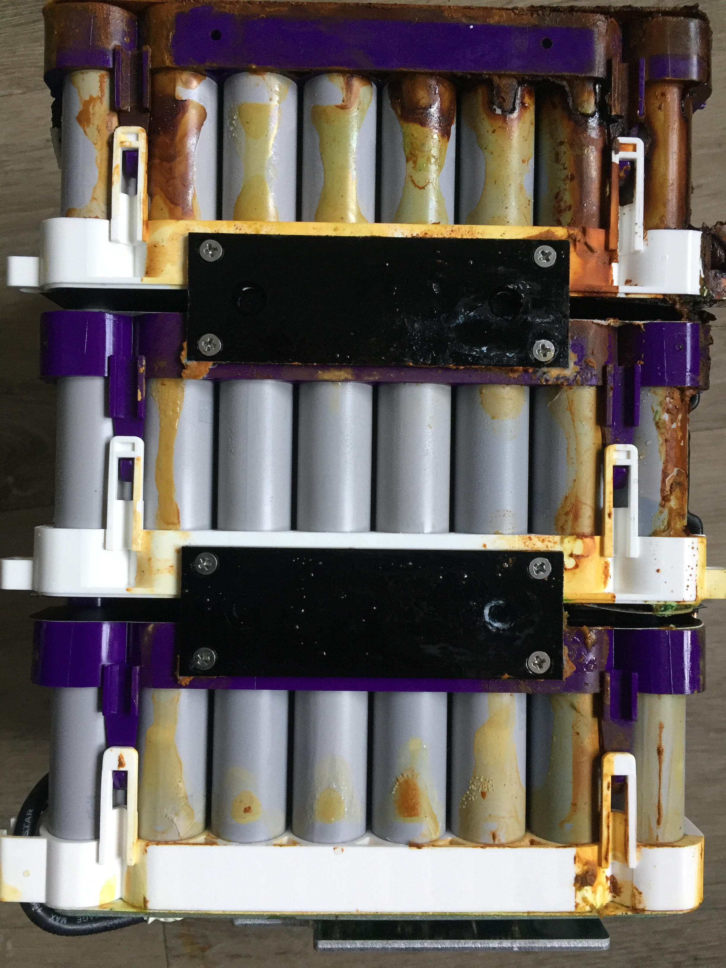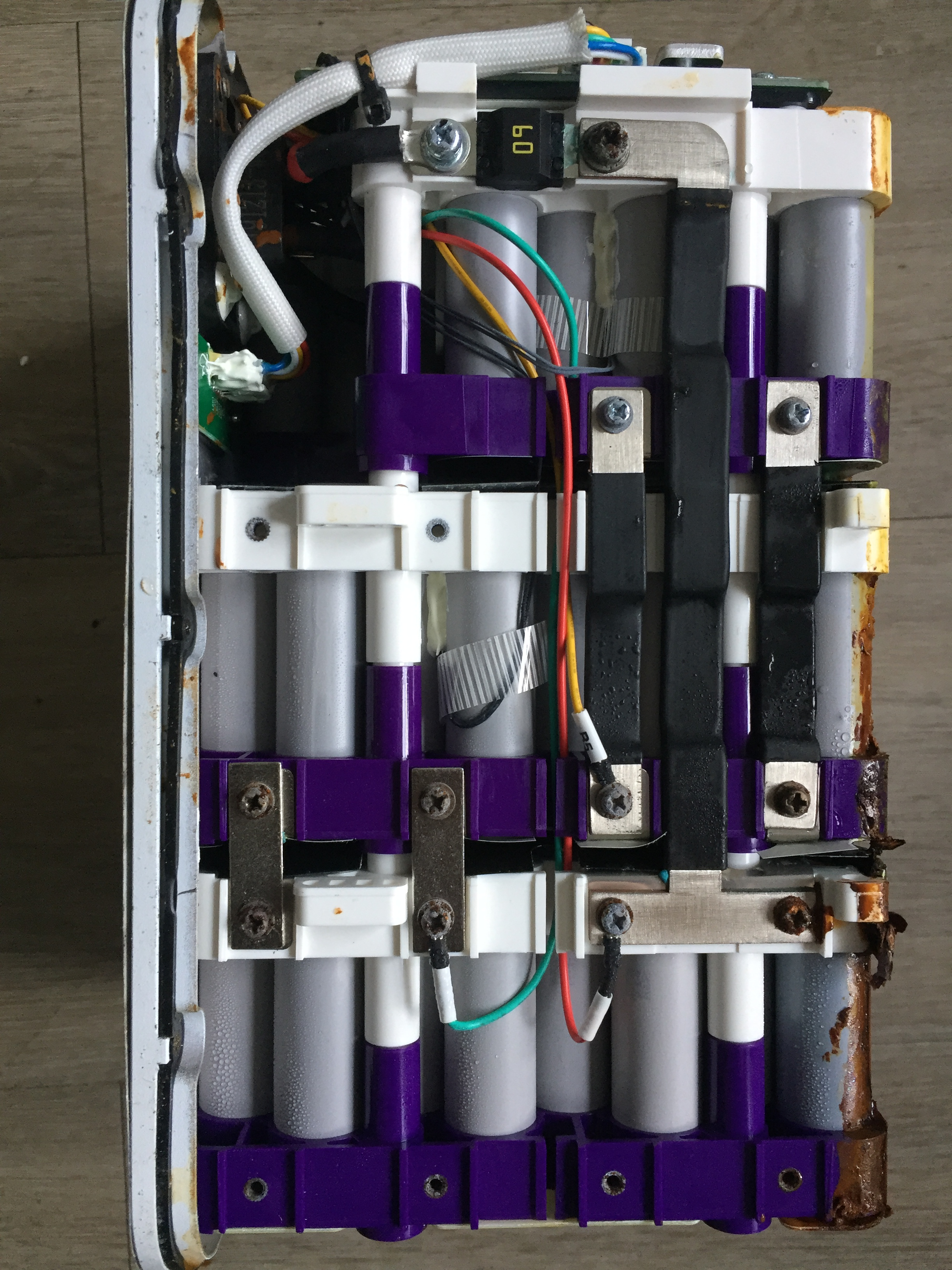 Leider funktionieren die PNs immer noch nicht. Ich denke es ist OK die Bilder offen ins Forum zu stellen. Von außen sah der Akku eigentlich ganz normal aus. Bei den leichten Rostspuren unter der oberen Klebefolie hatte ich mir noch nichts gedacht. Beim Öffnen roch der Akku dann als hätten einige Zellen ausgegast. Wie das Schadensbild entstanden ist? Keine Ahnung. Der Roller selbst ist völlig OK und fast neuwertig.