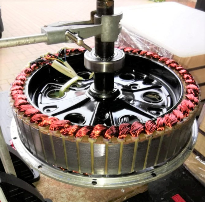We turned away the excentric shape, turning it into a true centric stator. After that came the coating with clear coat to inhibit corrosion, a set of new bearings and seals, and I put the motor back together. The now even, though slightly larger airgap gave the motor audibly and feelably more grunt, so that was a 100% successful endeavor :D