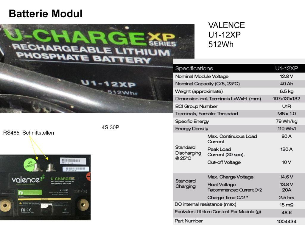 Nun zum Thema: Zunächst möchte ich Matthias bezüglich der in Enertia Basic verwendeten Batteriezellen/Module korrigieren. Zum Einsatz kommen hier 6 Module von Valence mit der Bezeichnung U1-12XP. Es handelt sich um eine völlig andere Chemie, ein anderes BMS, eine andere Software und eine andere Diagnose. Ich füge das Datenblatt bei. Es gibt auch ein Thema zur Valenzmoduldiagnose: