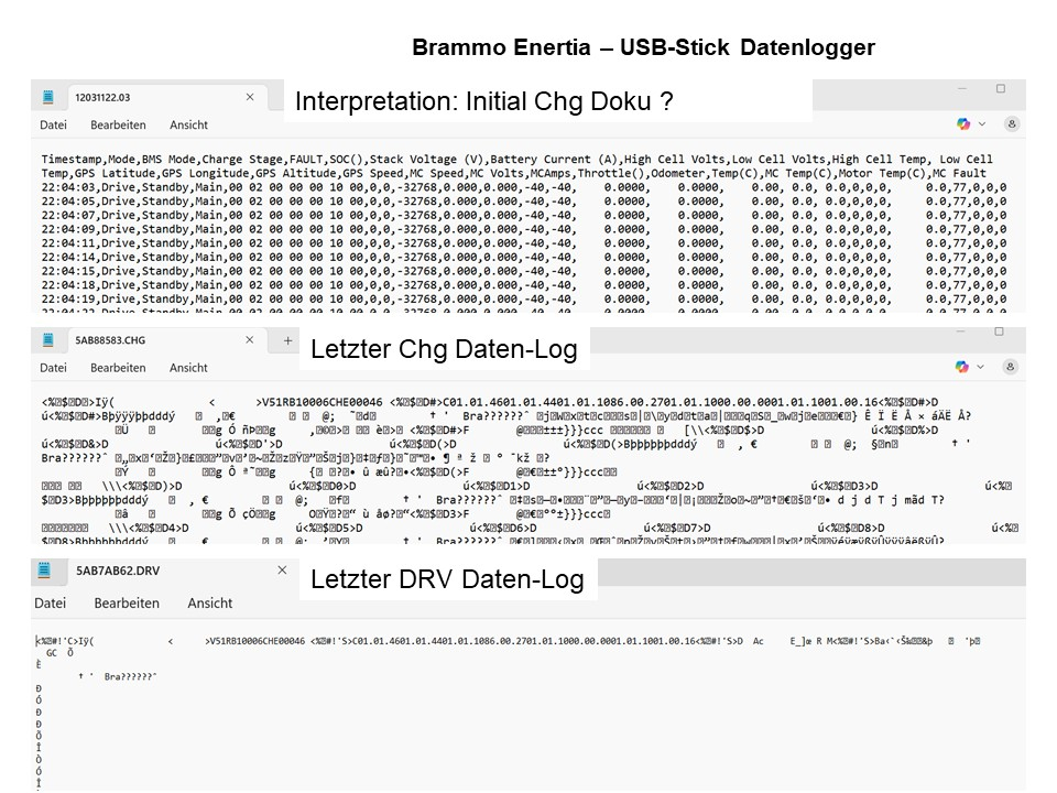 Heute, Sonntag habe ich den Data Log USB-Stick auf den PC kopiert und versucht die Dateien zu interpretieren. Anbei ein paar Screenshots. Die einzige lesbare Datei, wurde wohl bei Produktion 2012 abgelegt und dokumentiert die initialen Daten? Vermutlich kann man die aktuellen "*.chg" und "*.drv" Dateien nur mit einer passenden Brammo Diagnosesoftware aus Deinen Links in lesbare Informationen konvertieren. Mal sehen. Vielen Dank, Ralph