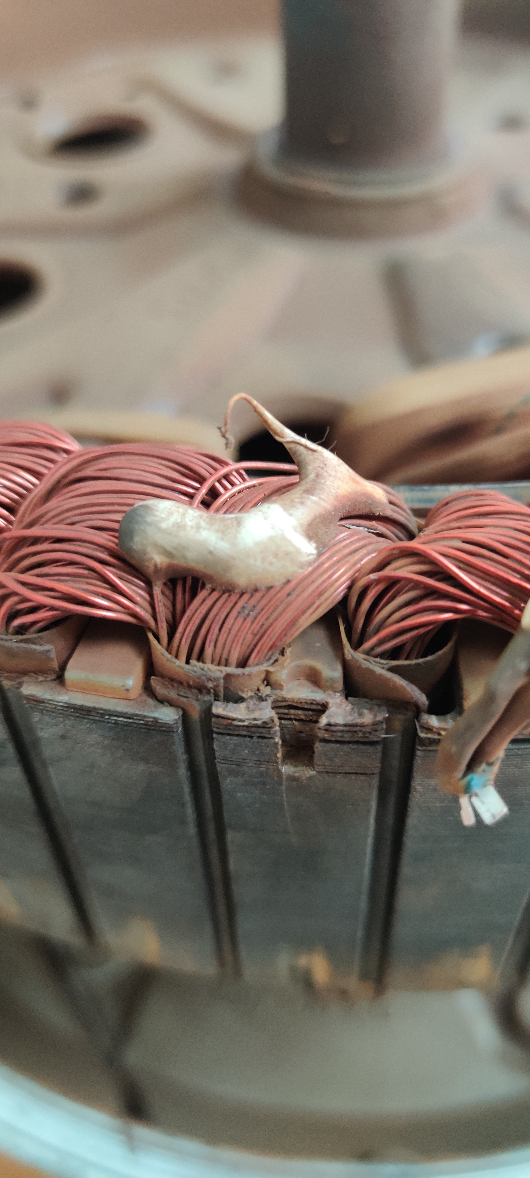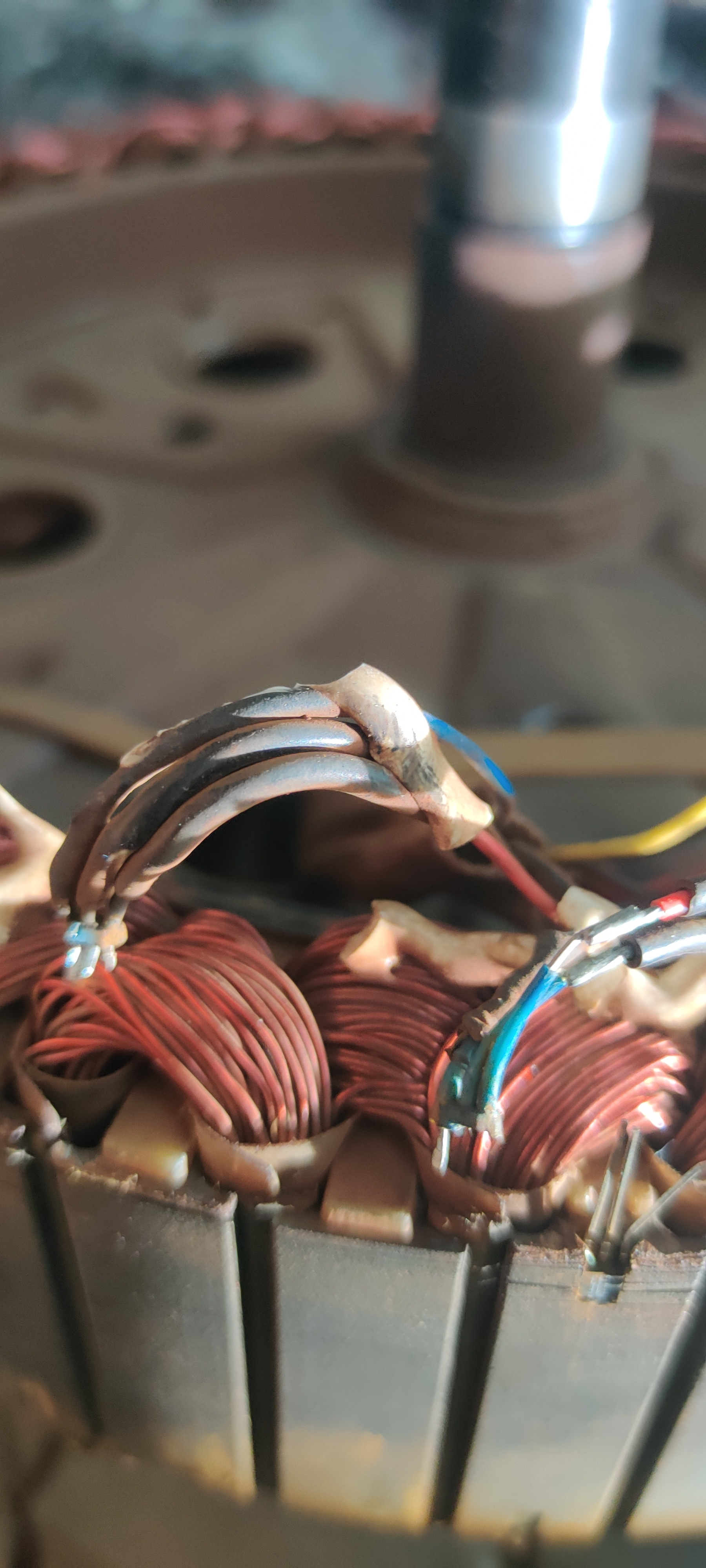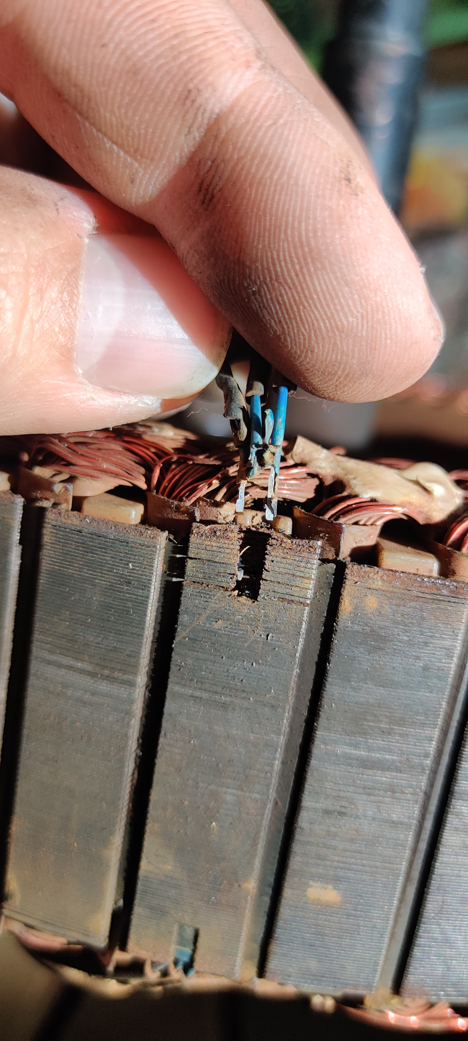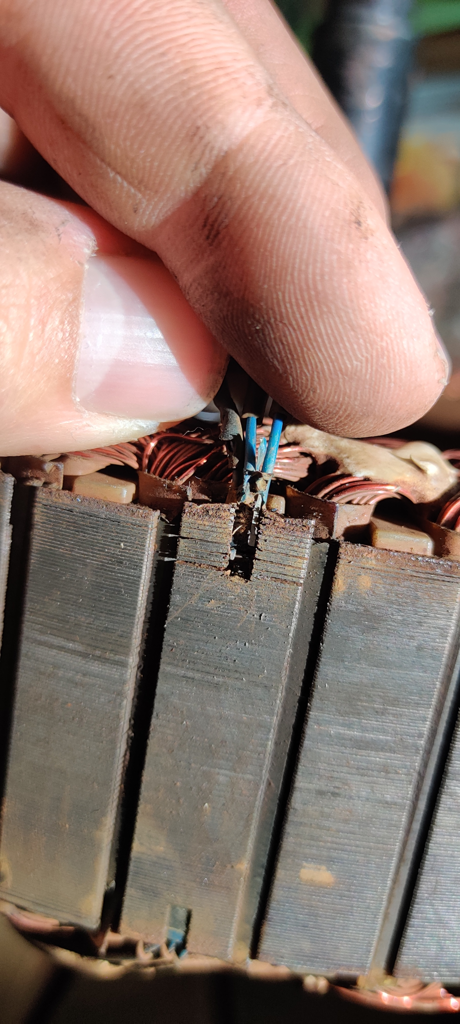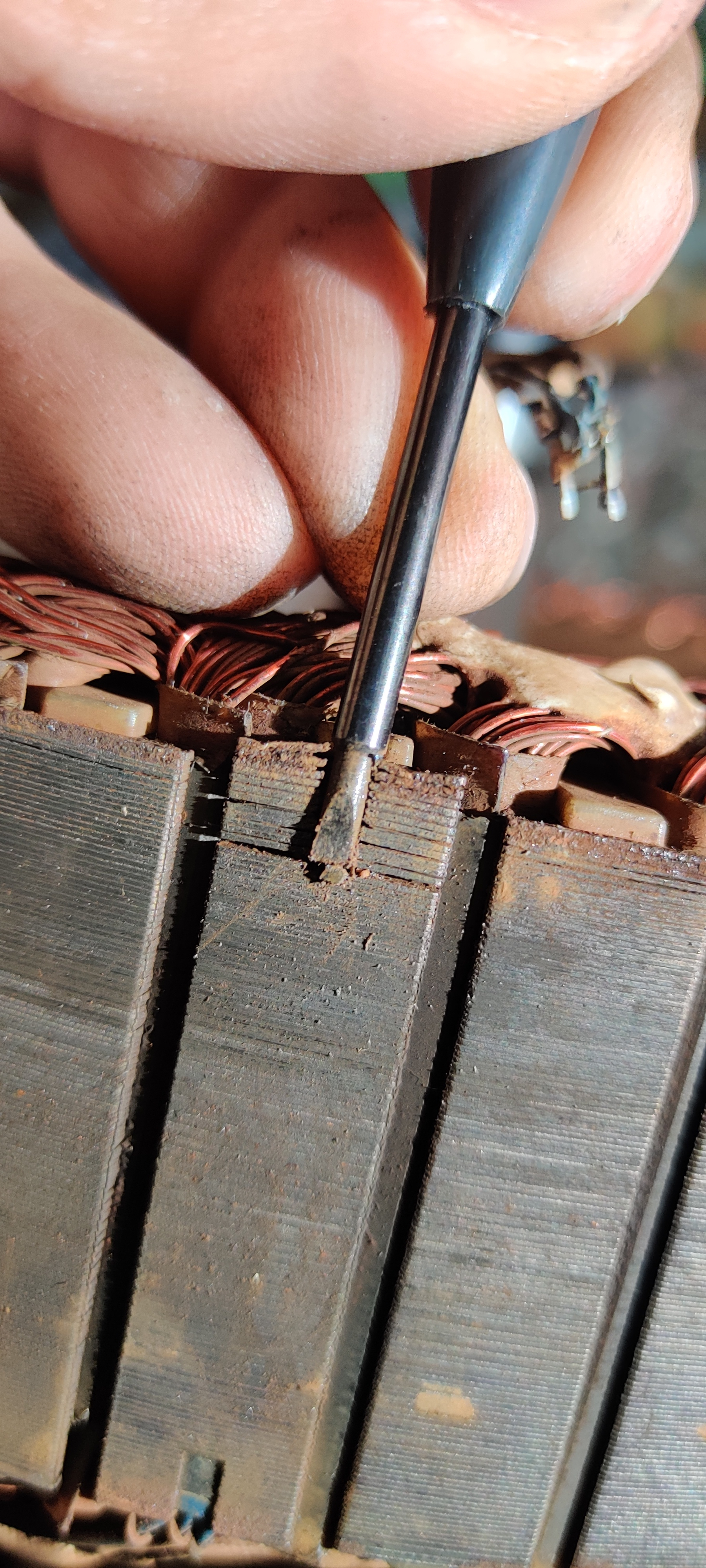 Man erkennt hier ganz gut, wie der Motor aufgebaut sind. Das Metall liegt in vielen dünnen Schichten aufeinander. Wenn man die Hall-Sensoren rausbekommen möchte, muss man ganz unten einen Schraubendreher (möglichst klein, Stromprüfer war bei mir zu groß) ansetzen und mit dem Hammer reintreiben. (Dezente Schläge)...