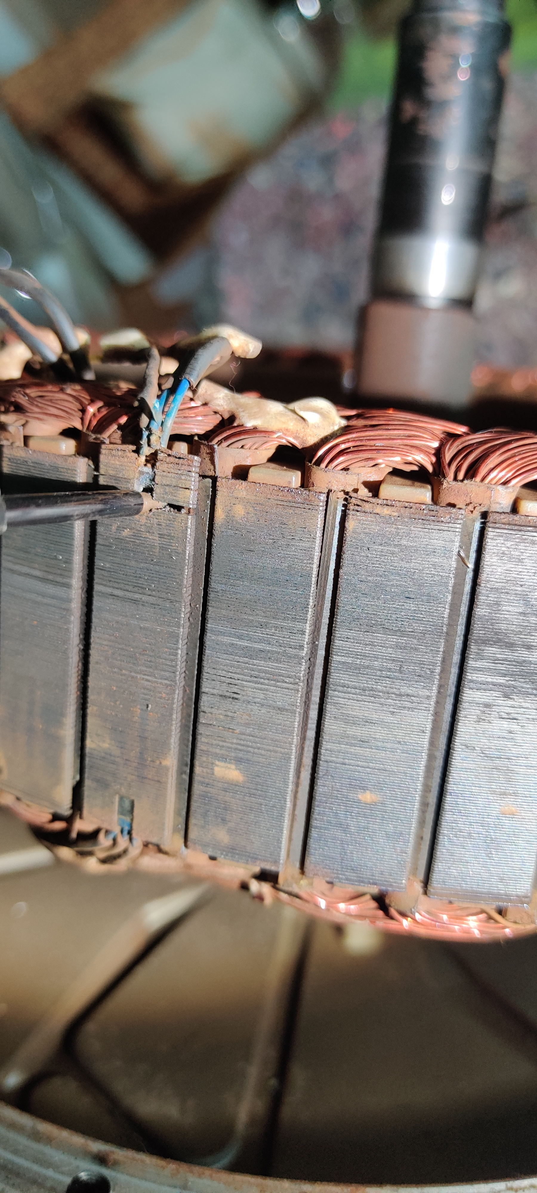 Man erkennt hier ganz gut, wie der Motor aufgebaut sind. Das Metall liegt in vielen dünnen Schichten aufeinander. Wenn man die Hall-Sensoren rausbekommen möchte, muss man ganz unten einen Schraubendreher (möglichst klein, Stromprüfer war bei mir zu groß) ansetzen und mit dem Hammer reintreiben. (Dezente Schläge)