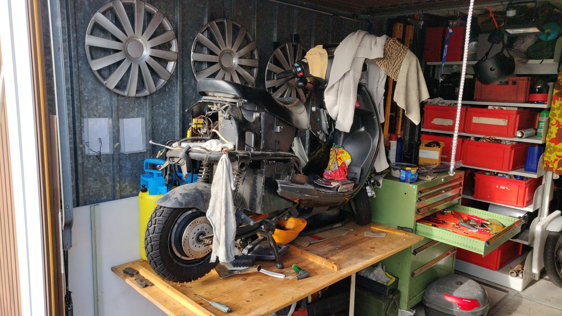Bevor hier Staub liegt, das Chassis steht auf der Werkbank, der Motor hat frische Lager, der ist aber von Roller 2. Bremssättel sind sauber und beweglich, Beläge nach 4500 km noch gut. Zu den 2 GoE ist nun noch eine Nova dazu gekommen und nächste Woche werden die 3 Roller freiwillig zugelassen, dann gibt's einen frischen Akku ohne Blei und das Gerät wird dann auch wieder bewegt.