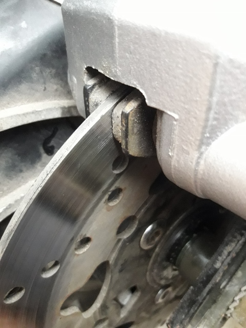 Es geht also leidlich, der Bremsbelagt schaut nicht mehr über den Rand der Bremsscheibe hinaus, am vorderen Ende ist er allerdings näher an der Achse. Auf Dauer ist das natürlich Murks.