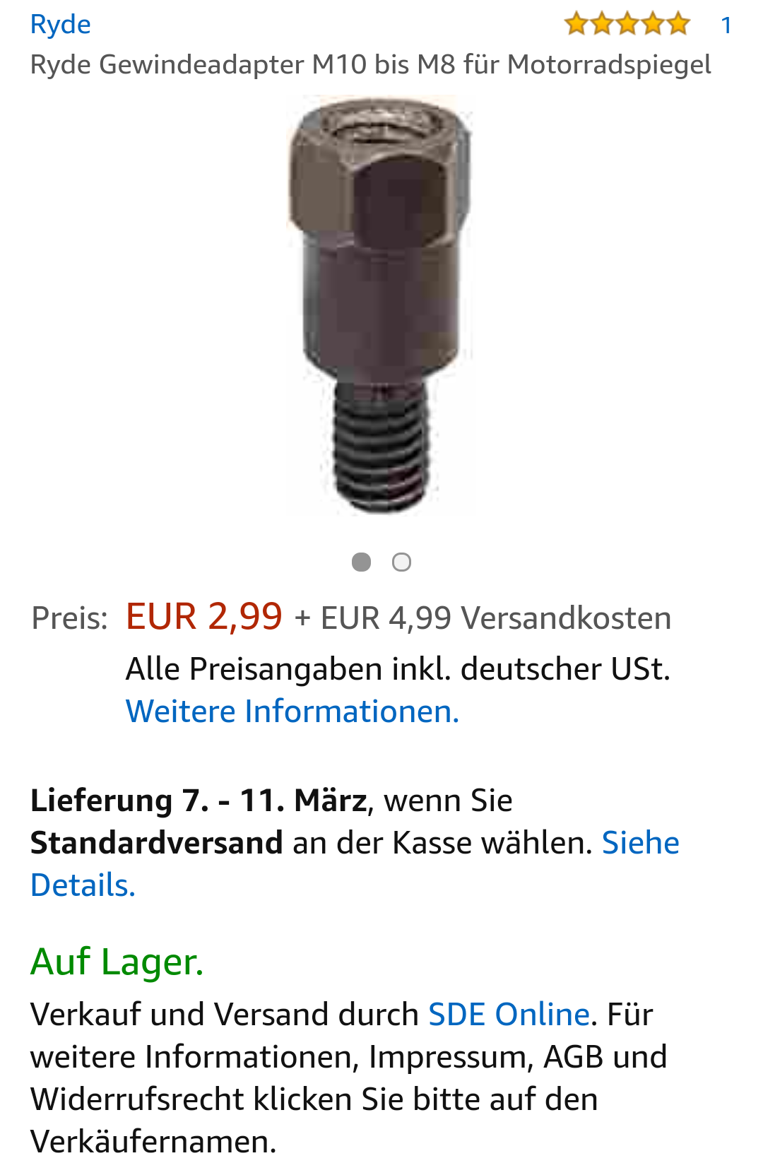 Nein, normalerweise reichen nur wenige Zentimeter. Die Spiegel sollen ja nicht über der Schulter angebracht sein, sondern der Blickwinkel durch die Spiegel muß ein wenig angehoben werden und da reichen oft ein bis zwei Zentimeter. Zudem soll der Blick ja nicht über die Schultern gern Himmel erweitert werden, sondern an den Schultern vorbei auf den rückwärtigen Verkehr. Breiter hilft da natürlich auch, nur schramme ich gerne mit den Spiegeln in der Garage gegen die Wand, wenn die weit über die Griffe hinausragen. Daher ist mir eine höhere Lösung lieber, als eine Breitere bei diesen kleineren Elektrorollern. Die Kombination aus mehr Höhe und Breite hat man mit „Spiegelverbeiterungen“, die die Spiegel weiter nach außen setzten und auch um ca. 2 cm anheben.Neuhauser hat geschrieben: Do 28. Feb 2019, 09:53 Die Dinger müssten 20cm lang sein, damit ich über meine Schultern schauen kann - die Breite der Spiegel ist doch das Problem.