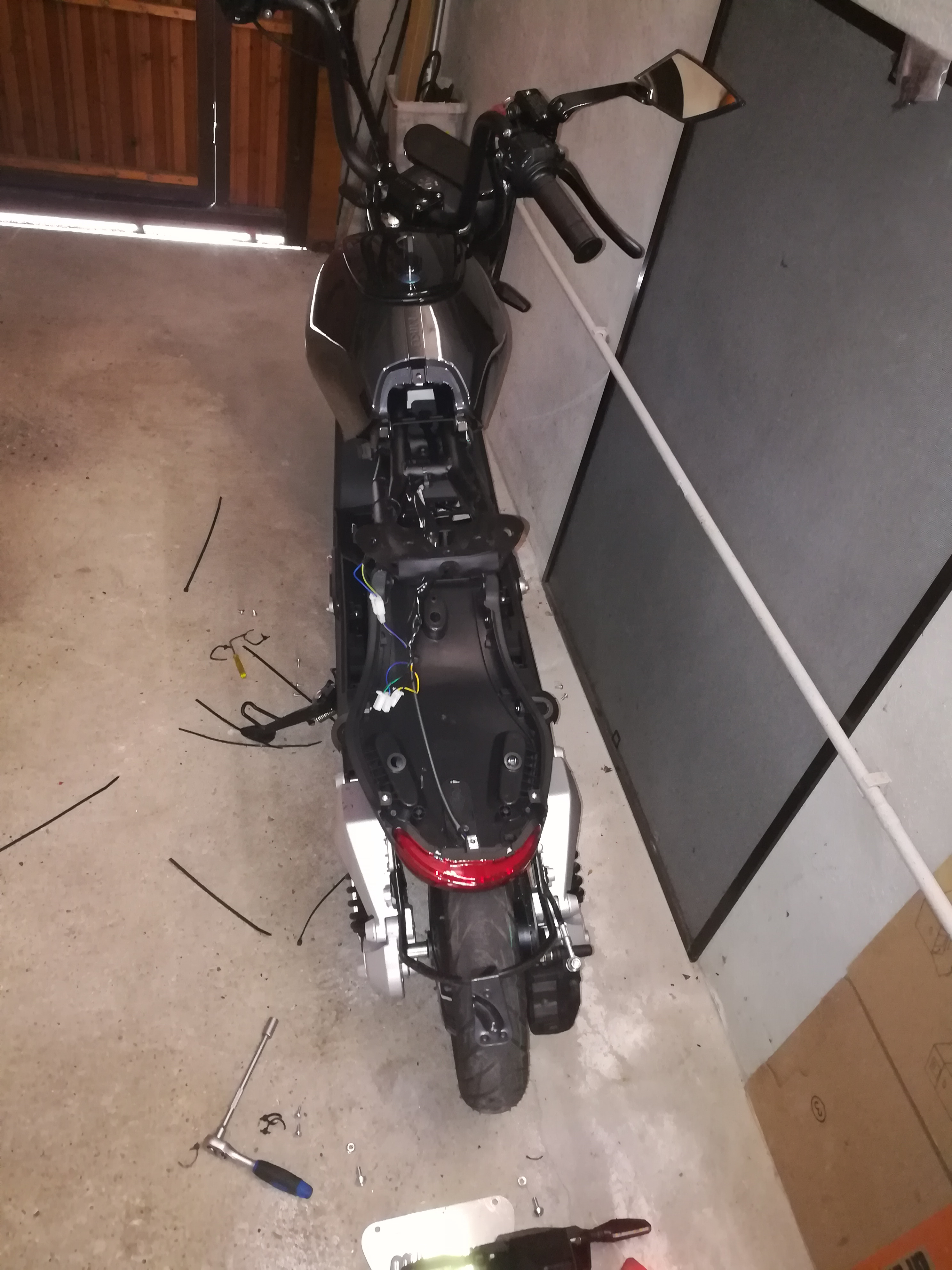 Hab dazu keine Anleitung gemacht, es muss die Frontverkleidung abgeschraubt werden ( ist eine große Platte wenn man das so sagen kann ), Batterie muss raus, Sitz muss abgebaut werden, Ablagefach muss nicht ausgebaut werden, Bremsleuchte in LED muss auch ausgebaut werden.