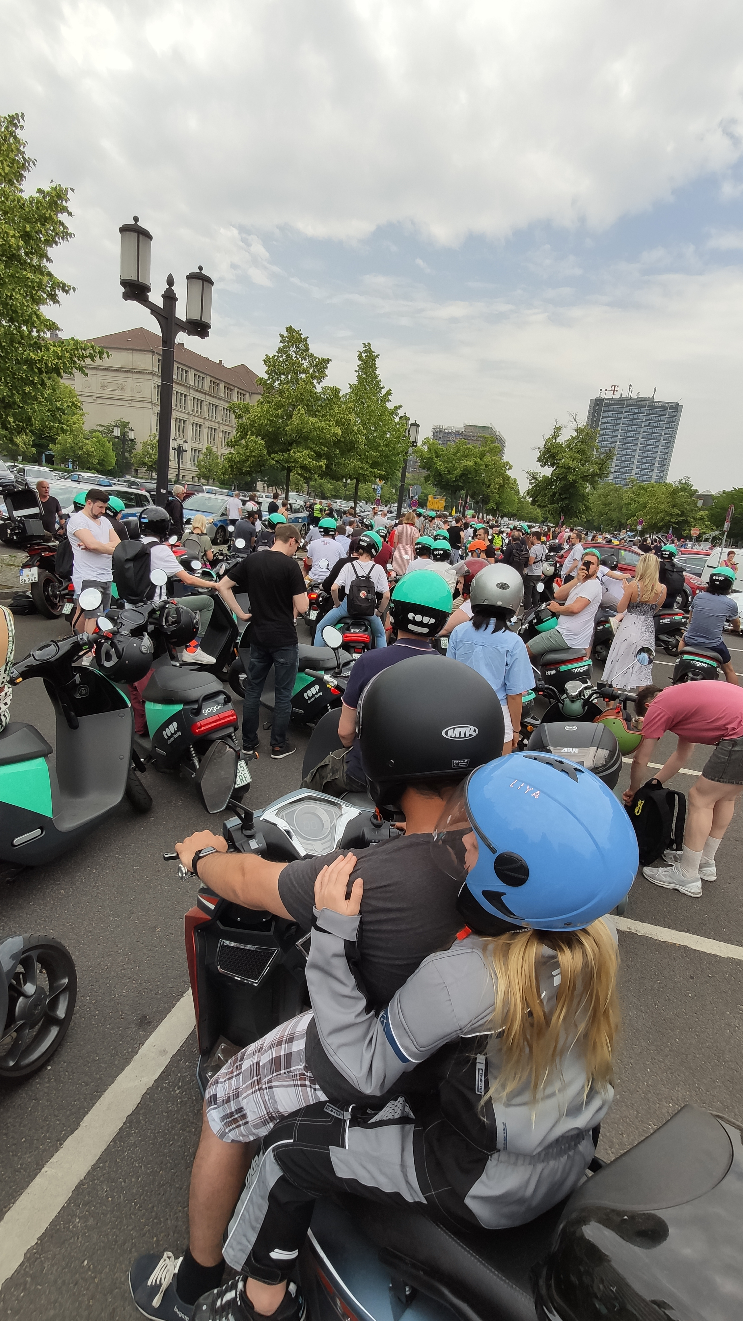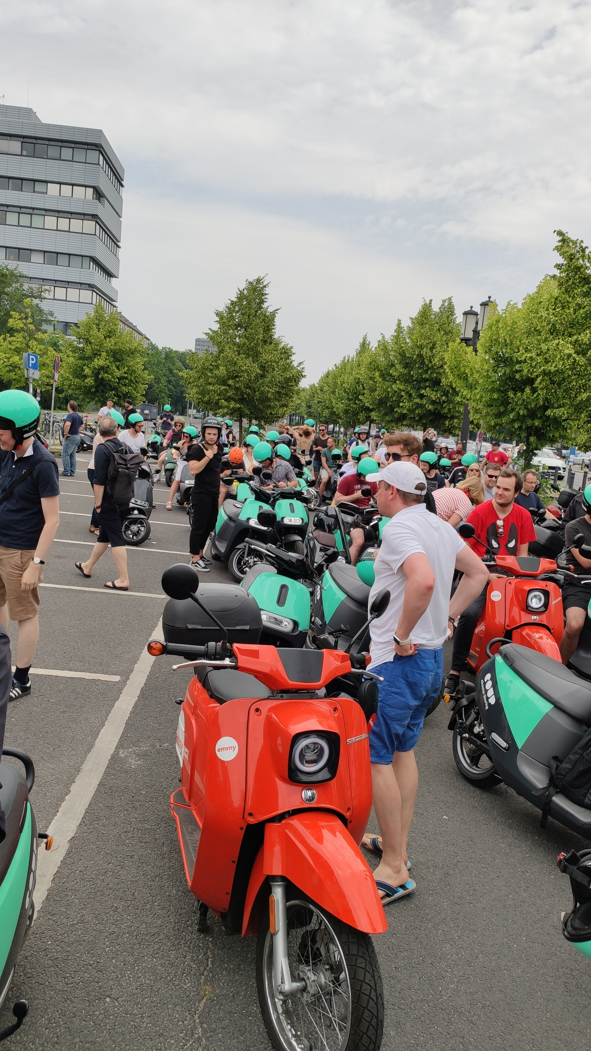 Zur Parade selbst kann ich mich auch nicht zu einer einheitlichen Meinung durchringen. Vorne wirkte es wie eine riesige Werbeveranstaltung für COUP Roller. Immerhin, es wurde relativ wenig gehupt, Ziel war ja der Stadt zu zeigen wie leise E-Mobility sein kann. So manches Mal hatte ich etwas Angst um die Passanten und Radfahrer. Einige haben den Sinn der Parade (und die Hinweise vorher) in keinster Weise verstanden. Es wurde alles befahren was sich bot, Radwege, Bürgersteige, Fahrspuren für den Gegenverkehr. Da möchte ich lieber nicht wissen welchen Eindruck wir hinterlassen haben.