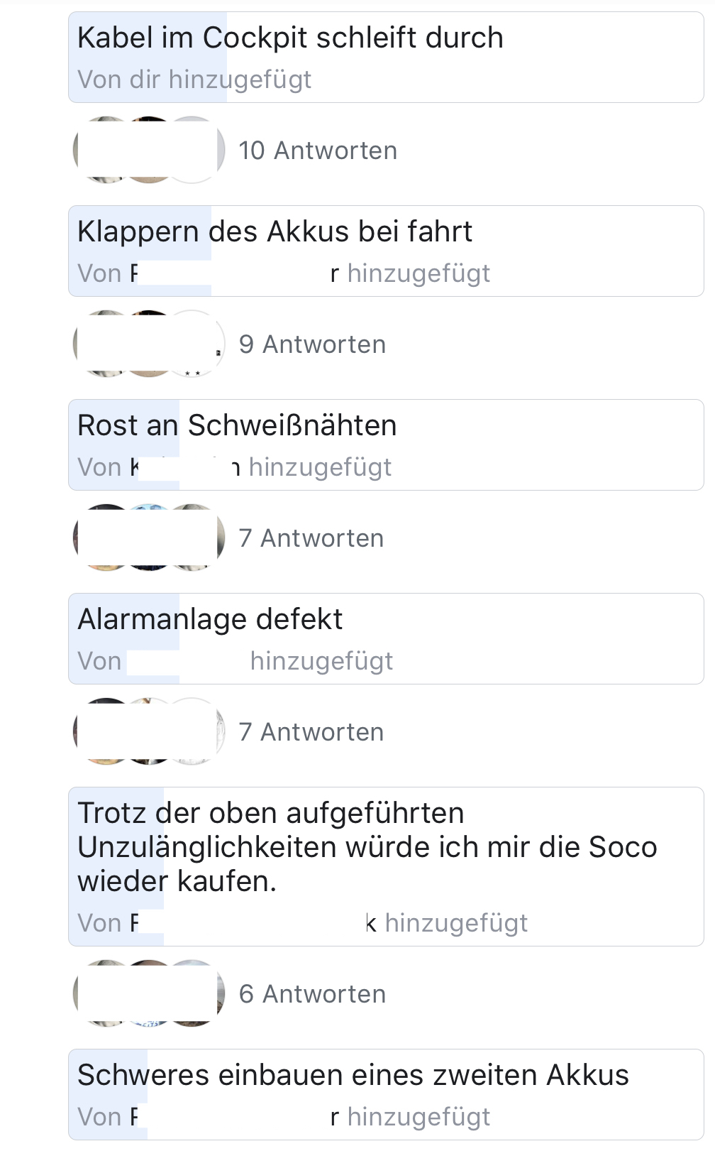 Elektrobob hat geschrieben: Do 8. Aug 2019, 13:01 Im Sinne der evtl. Käufer ist aber wichtig, von allem zuhören, wie die guten und auch die schlechten Seiten rundum der Soco sind. Ich freue mich für jeden hier, der keine Probleme hat (hatte ich für meinen Fall auch gedacht/gehofft), aber man muss bei aller Begeisterung auch objektiv bleiben und nicht alle Probleme kleinreden (hast du nicht gemacht). Sachlich beide Seiten vortragen (…)