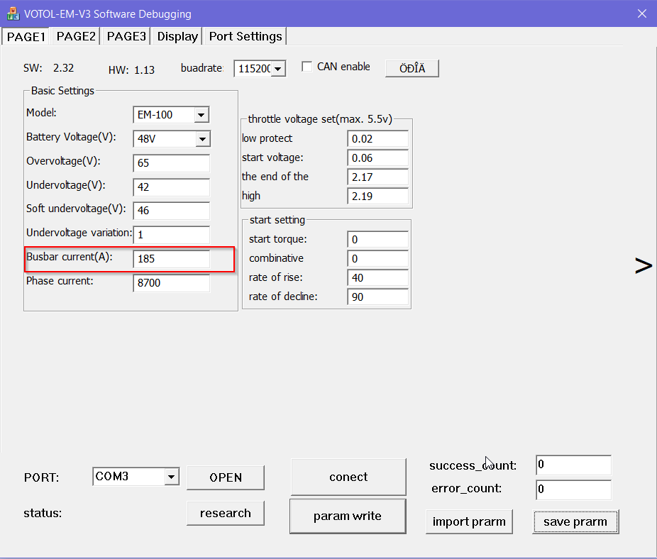 Mir fehlt da noch das Verständnis dafür. Es scheint, als würde sich der VOTOL an diese Begrenzung halten, aber nur im low und mid-Modus. Ich habe bei meinen Versuchen keine Änderung auf das Fahrverhalten festgestellt, unabhängig von 170 oder 230! Im Sport-Modus zieht der Roller in beiden Einstellungen maximal den Strom der im SPORT-Limits auf PAGE2 eingestellt ist - gleichzeitig hat eine Reduzierung dort einen Einfluss auf alle Fahrstufen.Busbar Current mit 185A als Kompromisswert zwischen 170 und 200A.