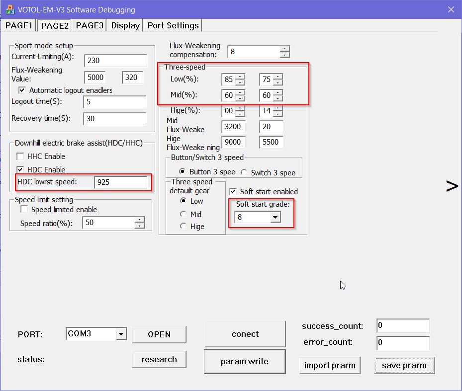 Die Geschwindigkeit von ECO, CITY und SPORT finden sich prozentual anteilig in der ersten Spalte von "Three speed" auf PAGE2, bei maximal 100 km/h entsprechen die % dann auch den km/h.