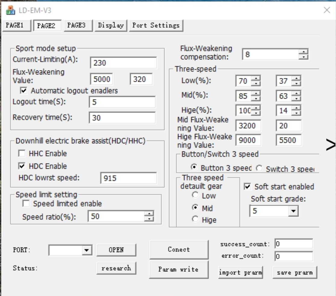 In der zweiten Spalte, aber nur für LOW und MID, werden die anteiligen maximalen Ströme bezogen auf den "Current-Limiting(A)" Wert im "Sport mode setup" links oben auf PAGE angegeben. 37% von 230 A(mpere) sind 85 A, das könnte aber knapp werden mit 80-85, spätestens bei Gegenwind.