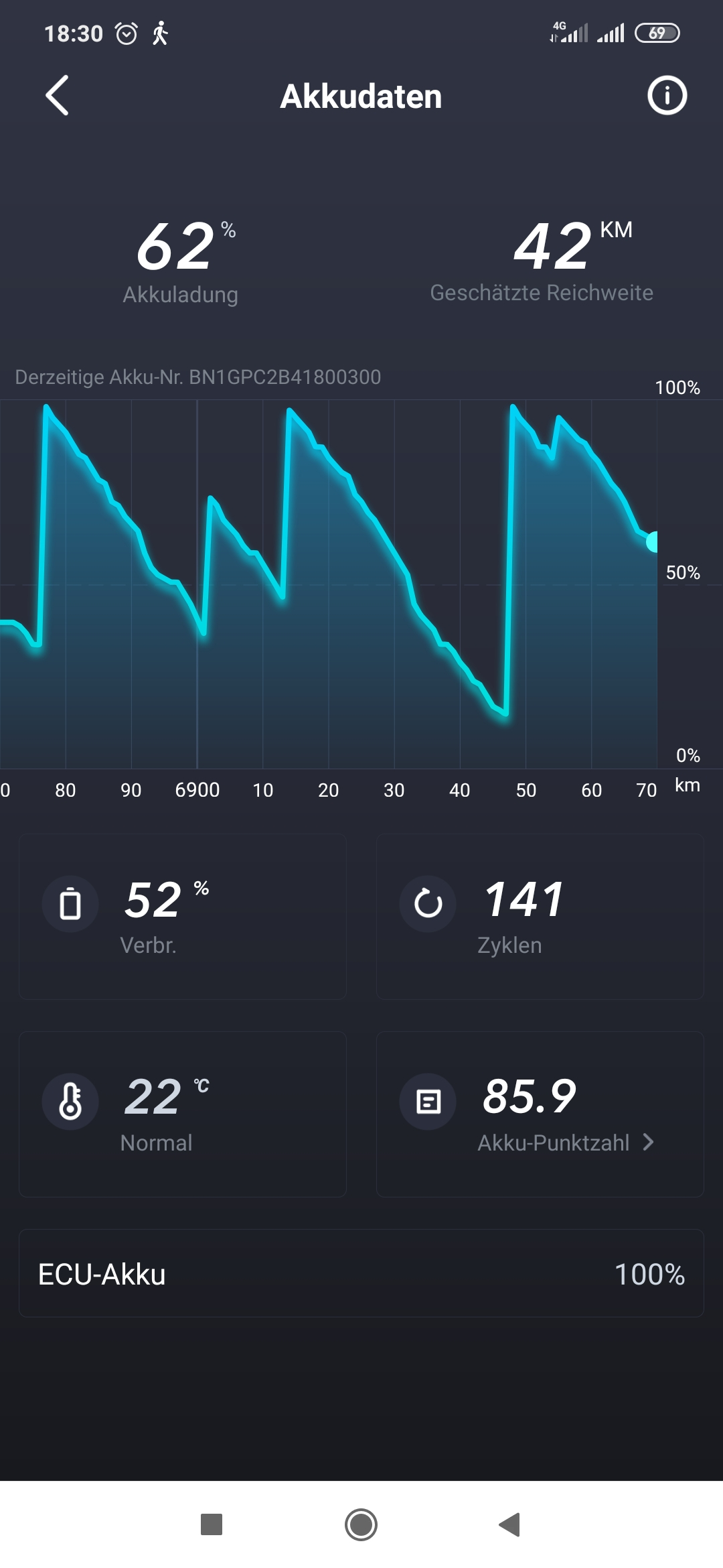 Modell N1S, fährt seit Mai 2019, jetzt bei 5176km, Akku bei 90.1 Punkten.
