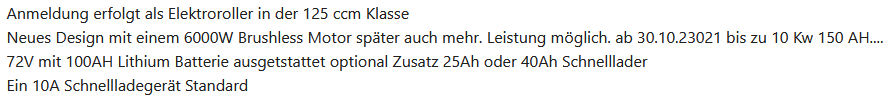 Ich glaube nicht, dass die ungenaue Angabe des Jahres (23021) Zufall ist...später auch mehr. Leistung möglich. ab 30.10.23021 bis zu 10 Kw 150 AH