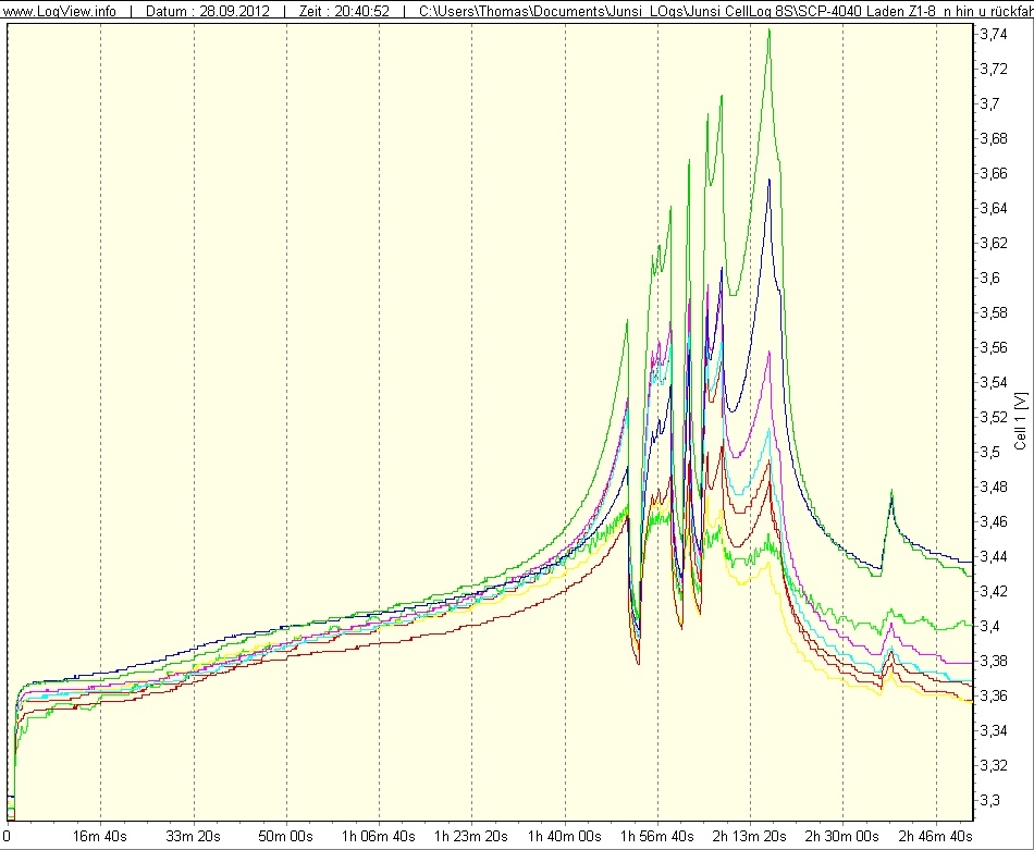 Doch scheinen die Stufen bei ALLEN Zellen aufzutreten und sind daher eher Messbedingt. Nur bei der Nr 3 (die 5te von oben) gibt es bei etwa 15:29 rum einen kurzen Anstieg im abfallenden Ast zu verzeichnen, der von einer Erholungsphase zwichen Balancing-Pausen herrühren könnte. Aber überzeugend ist das nicht...