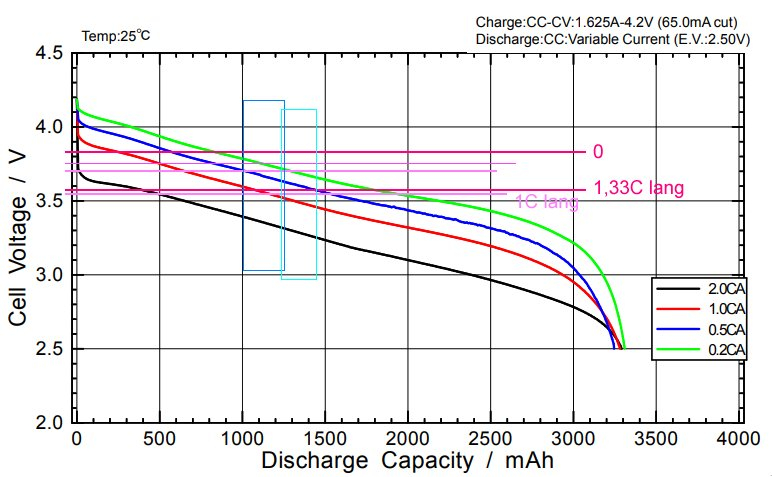 Zuerst hab ich mal die Leerlaufspannung vor meiner Berg-Belastung und die Spannung bei ~120 Ampere (2C) in mein geliebtes Panasonic 18650 Li-Ion Std Diagramm in rosa eingetragen. Dann hab ich den angenommenen Bereich auf der Kennlinie mit dem hellblauen Kasten markiert.