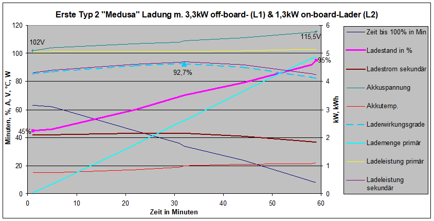 Auf Phase L1 kam der externe 3,3kW TC Lader, auf Phase L2 der 1,3kW on-board-Lader der Zero. Ladung ging nur von 45 auf 95%, mit folgendem (massiv überbevölkertem) Verlauf über Ladedauer: Primär zogen beide Lader im Tandem knapp über 5kW, was sekundär mehr im Bereich von 4,3 bis 4,7kW in die Batterien schaufelte. Um die 42A Batterieladestrom brachten die zwei Lader zustande, 30A vom TC, der Rest vom on-board-Lader. Die Ladezeit-Prognose (auf 100%) der Zero ist recht genau, mit nur einem kleinen Knick ganz am Anfang, aber ansosten recht linearem Verlauf.