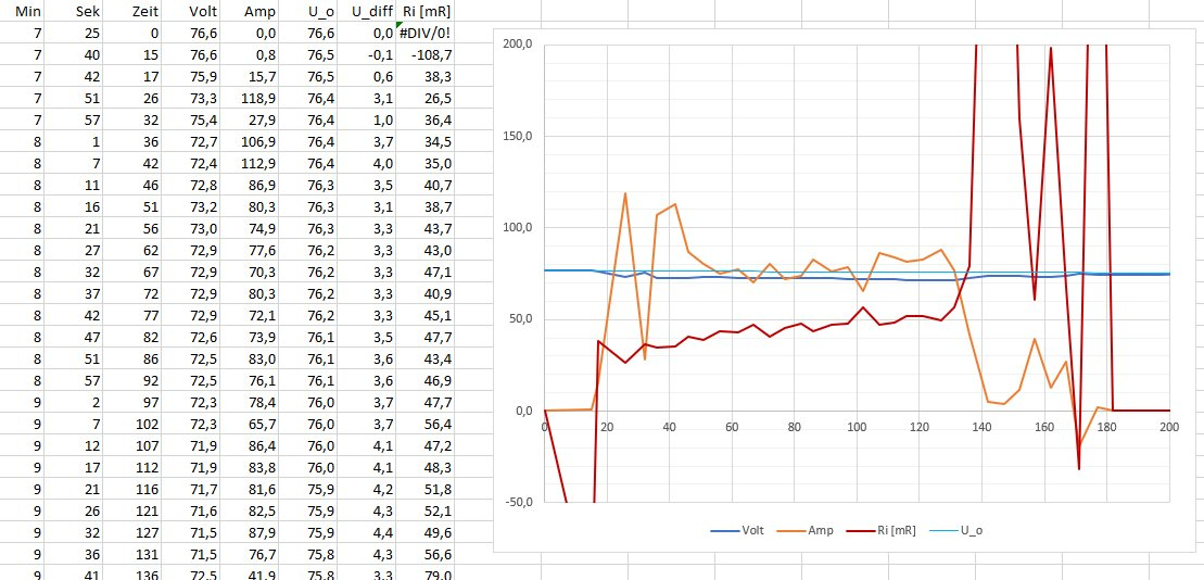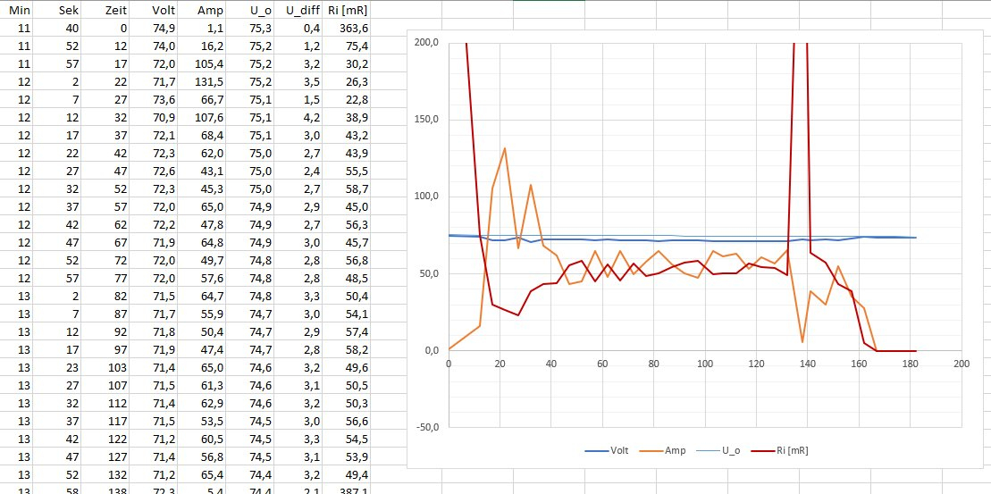 Ich hab von den Recordings bei dem 'Schnellstrassentest' mal jeden Wert in ein Excel gepackt. Rot ist der Innenwiderstand der Zellen (ohne Stecker, Kabel, MOSFETs(?), etc), berechnete aus Spannungsrückgang (der Zell-Summenspannung gemessen vom BMS) und Strom.