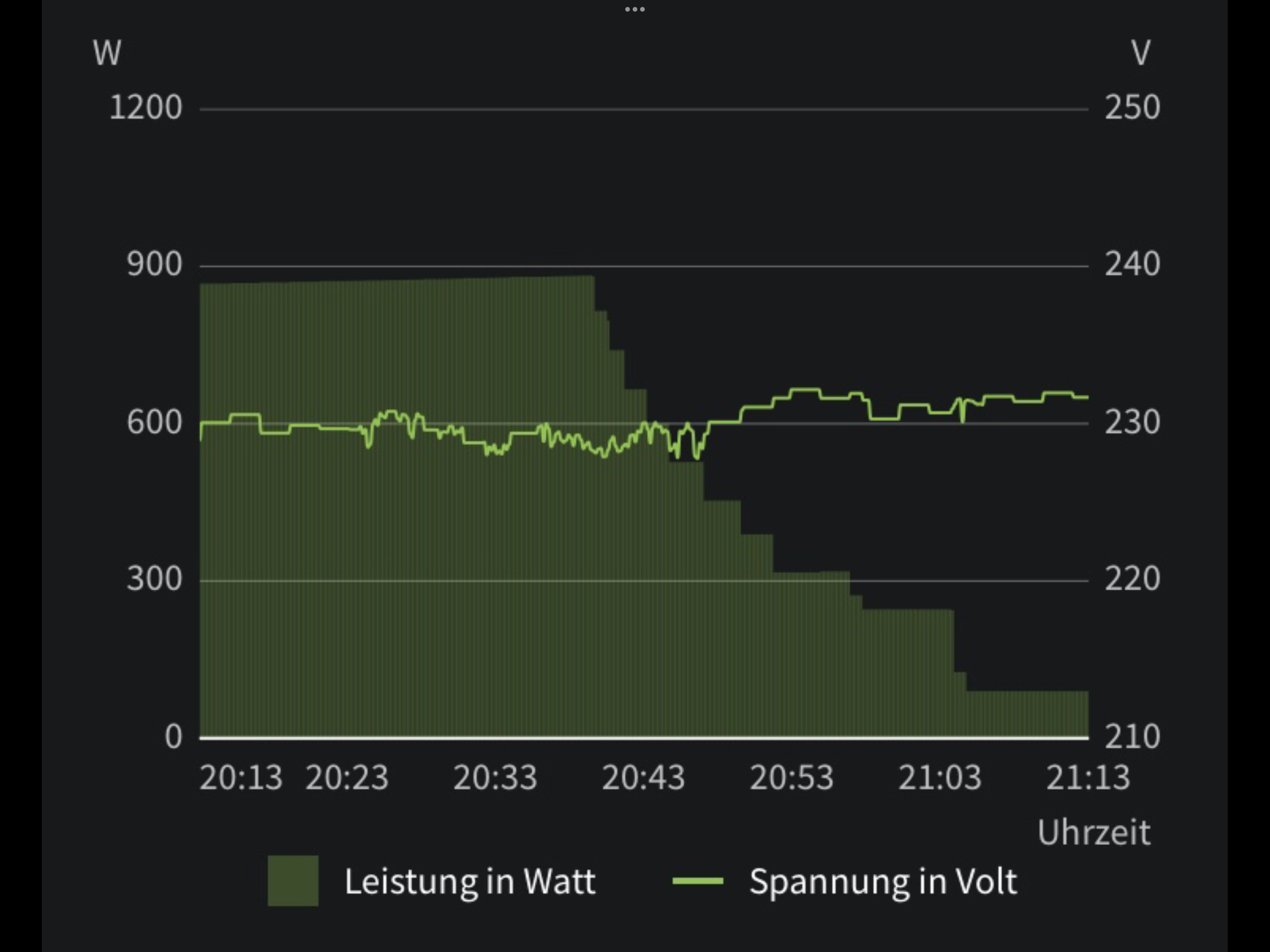 Ein Akku, von 20% auf 100%: in etwa um die 880W wird der Maximalwert erreicht und fällt dann stetig ab. Dauert dann ca. 35 Minuten und das Ladegerät schaltet mit der led auf gelb. Der Lüfter ist etwas laut, fürs Wohnung Laden geeignet in Räumen die nicht dem Schlafen dienen