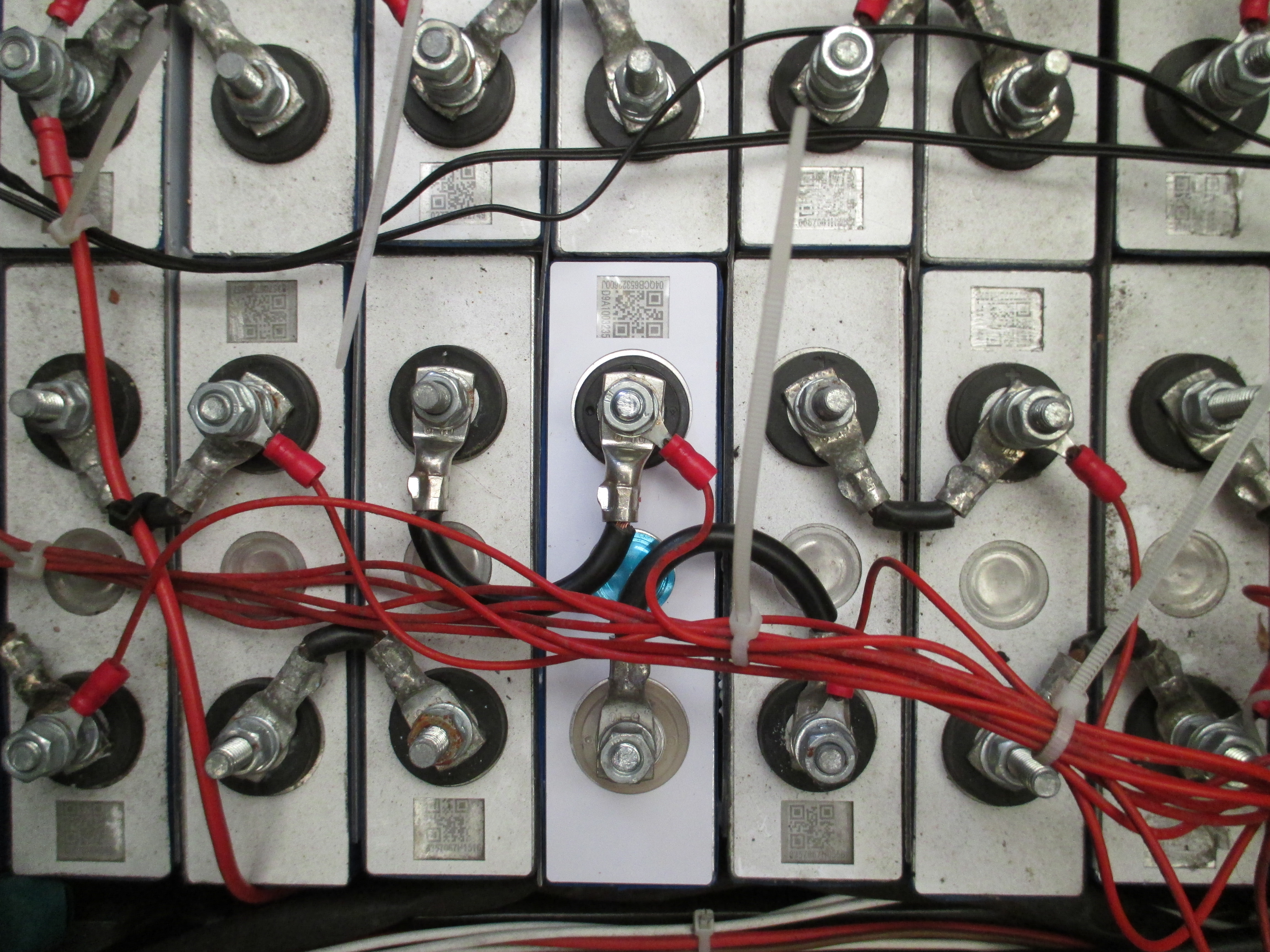 Der Umbau begann 2018. Leider hat sich an den Muttern und teilweise an den Kabelschuhen der Balancerkabel Rost gebildet. Zusehen z.B. am Pluspol von Zelle 7. Kein Wunder, dass das BMS für einige Zelle zu hohe "Wire Widerstände" meldet. Ab Zelle 6 muß ich ja wieder die Balancerkabel um eine Zelle aufrücken. Die Rohrkabelschuhe für den Fahrstrom sind ja vorne geschlossen. Die Seite mit der Kabeleinführung hätte man mit Schrumpfschläuchen versehen sollen.
