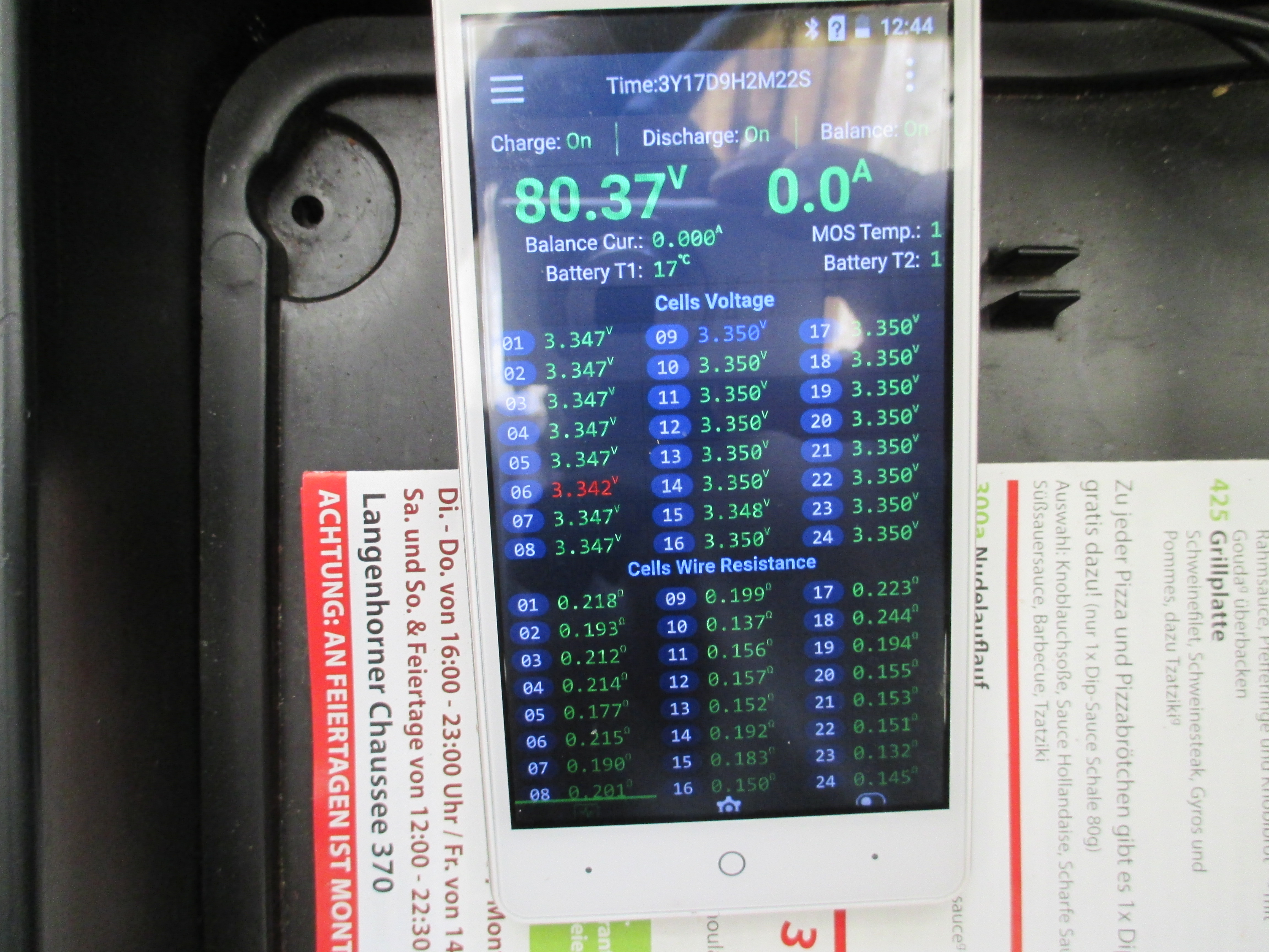 Heute Morgen die Balancerkabelreihenfolge auf 24S geändert, einige Unterlegscheiben und Muttern ersetzt. Das Jkong BMS auf 24S gesetzt. Die Balancerkabel Widerstände sind alle wieder im grünen Bereich und das BMS balanciert auch wieder, was es bei einem Wert > 0,48 ja verweigert hatte.
