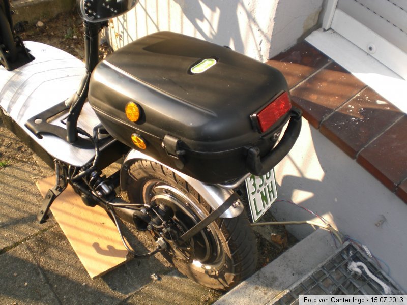 Da es sonst nicht viel zu berichten gibt, zeige ich Euch mal mein Feierabendprodukt. Dank eines zweiten, mir zur Verfügung stehenden Gepäckträgers, den ich in Silbermetallic lackiert hatte, habe ich nun eine schnelle und einfache Wechselmöglichkeit zwischen Gepäckträger mit Korb und Gepäckträger mit Topcase.