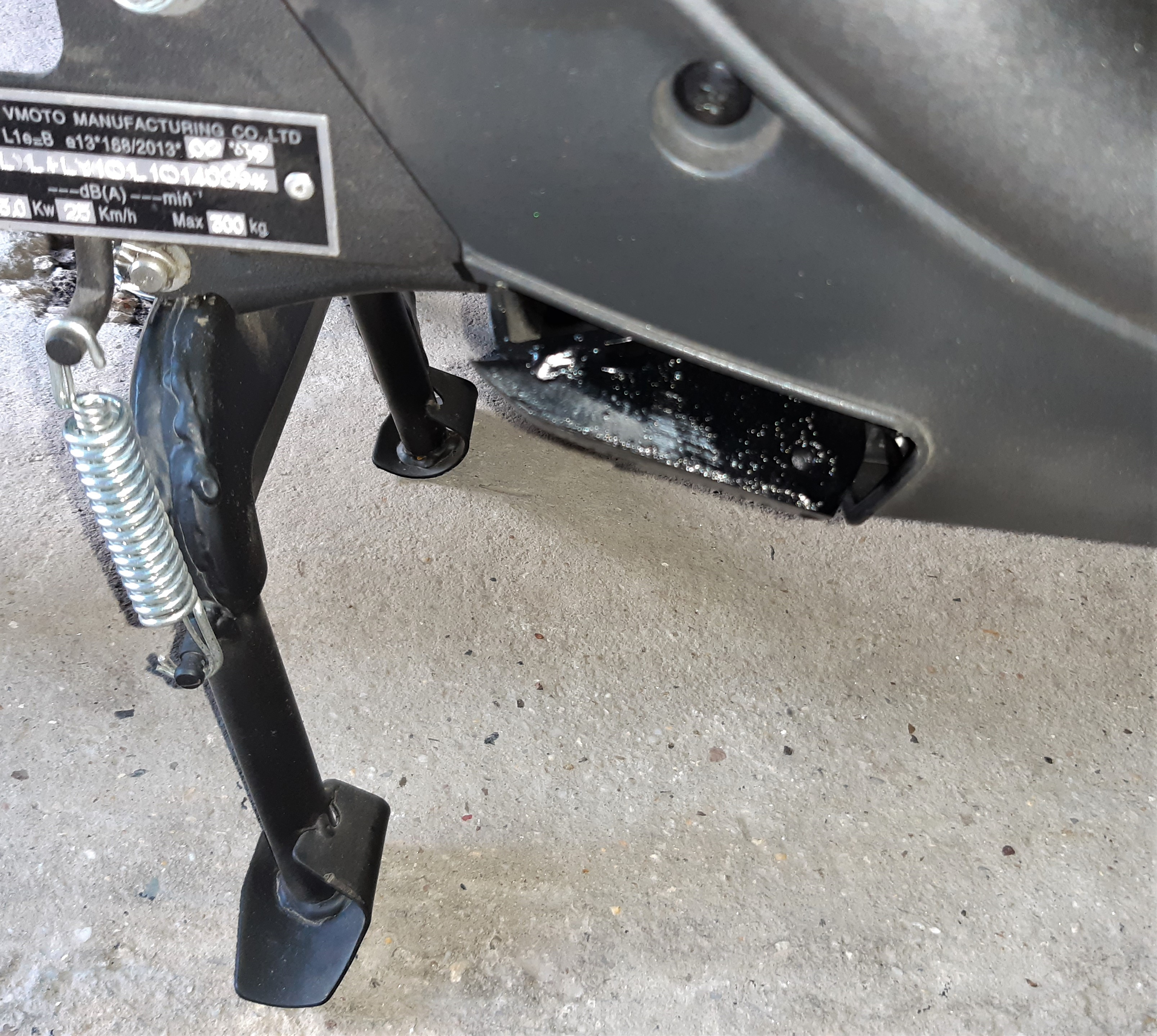 In weiser Voraussicht habe ich gestern vor der ersten Tour die Federvorspannung schon mal eine Raste angezogen. Bei der Fahrt hat sich dann neben dem schief stehenden Lenker herausgestellt, dass das Fahrwerk nicht so wahnsinnig viel Haftung vermittelt hat. Also heute Verkleidung runter und erstmal den Lenker gerade gestellt.